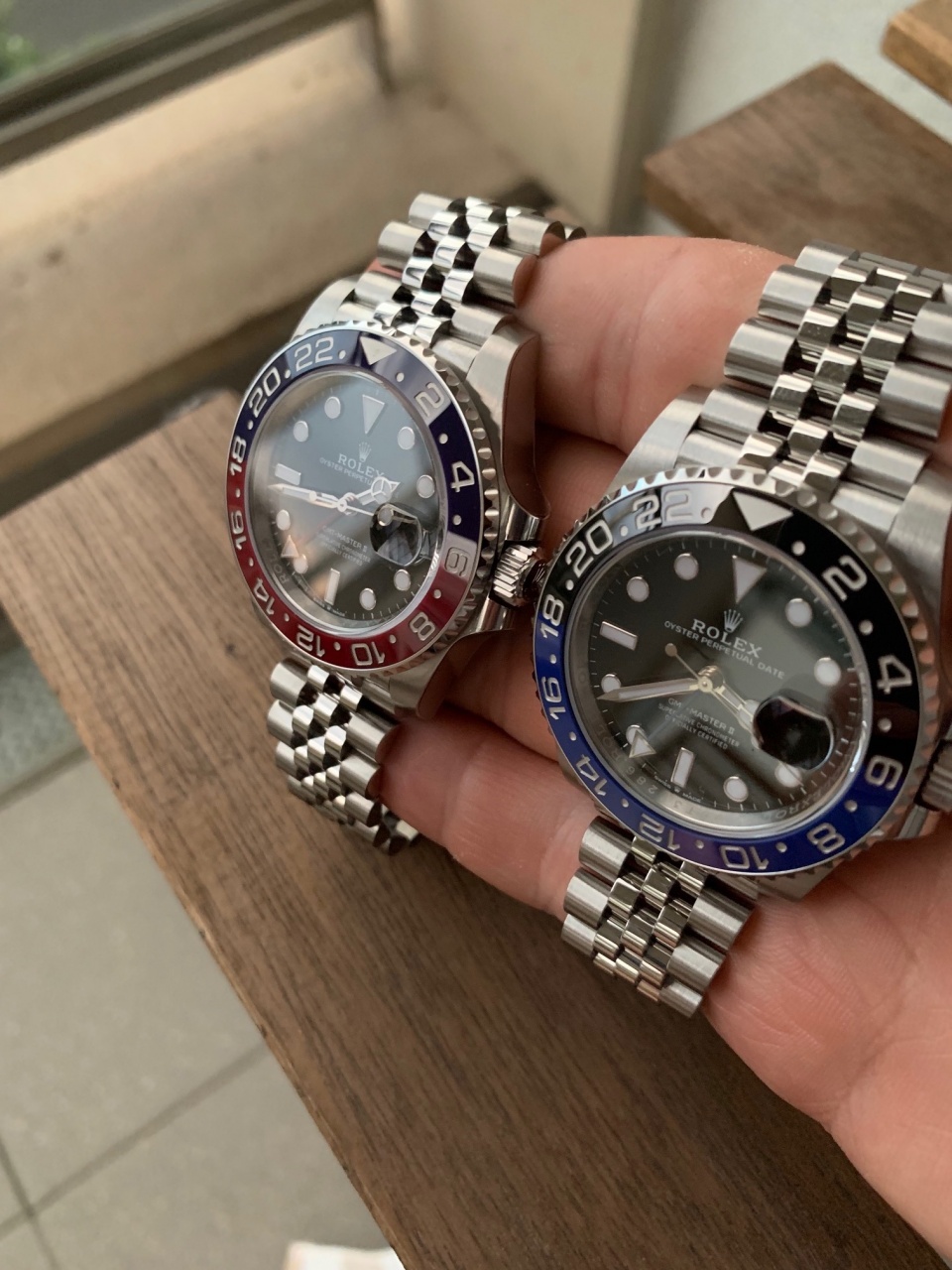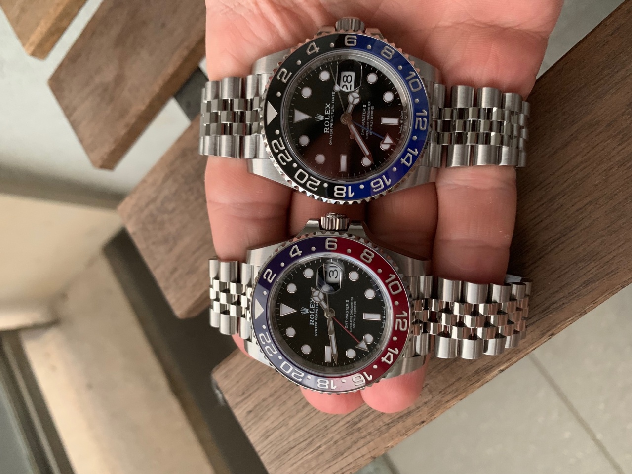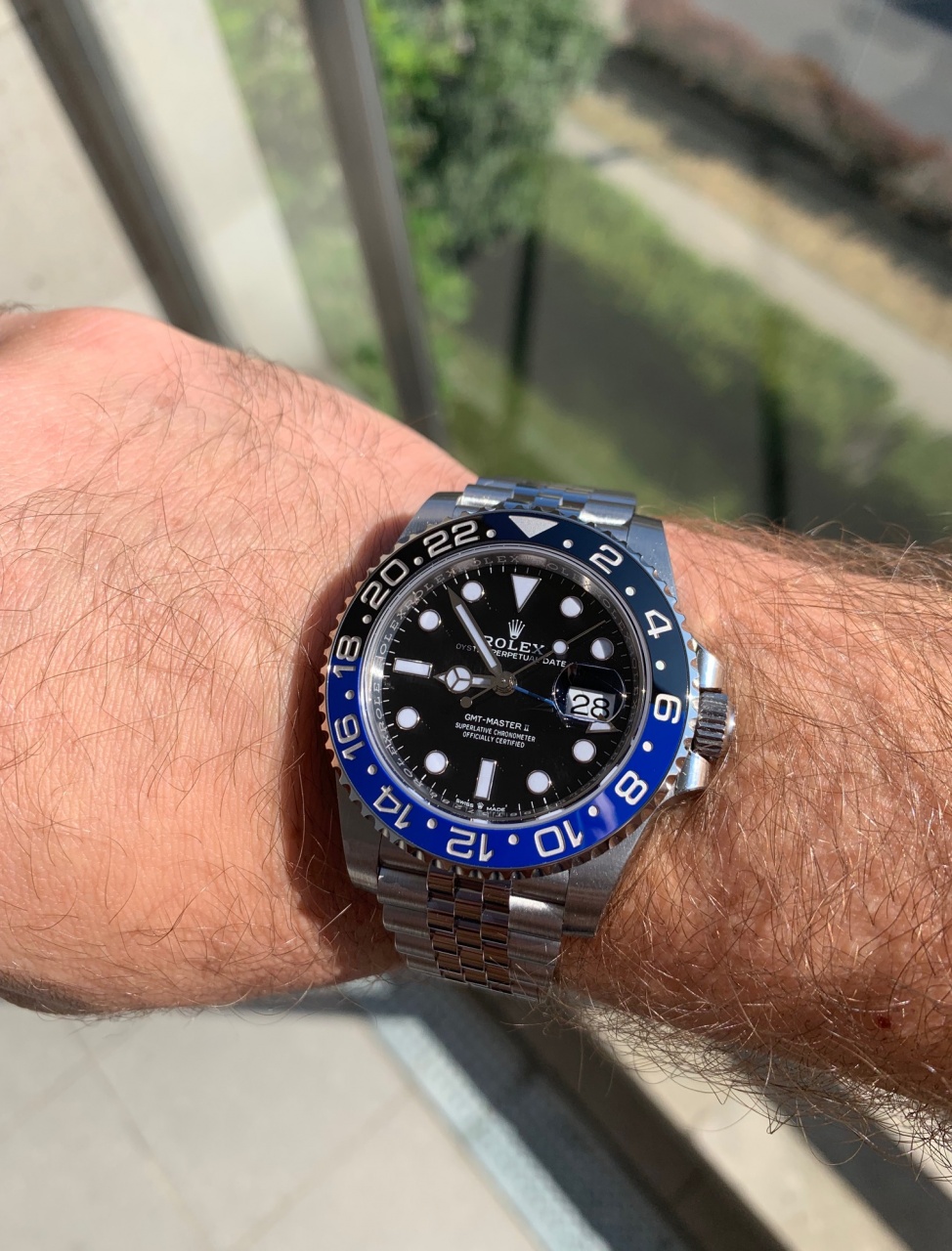 А тут весной вышел новый Бетмен на браслете Джубили, и вопрос с полированными звеньями отпал сам по себе. Очень хотел покрутить часы в живую, так как на форумах были противоречивые отзывы. И вот неделю назад купил их. Хочу сказать, что на Джубили они смотрятся просто по другому - не хуже и не лучше чем на ойстере. Это просто другие часы и они либо нравятся либо нет! На руке лежат идеально, намного комфортней чем на ойстере (18 cm запястье) также как и новые Пепси).