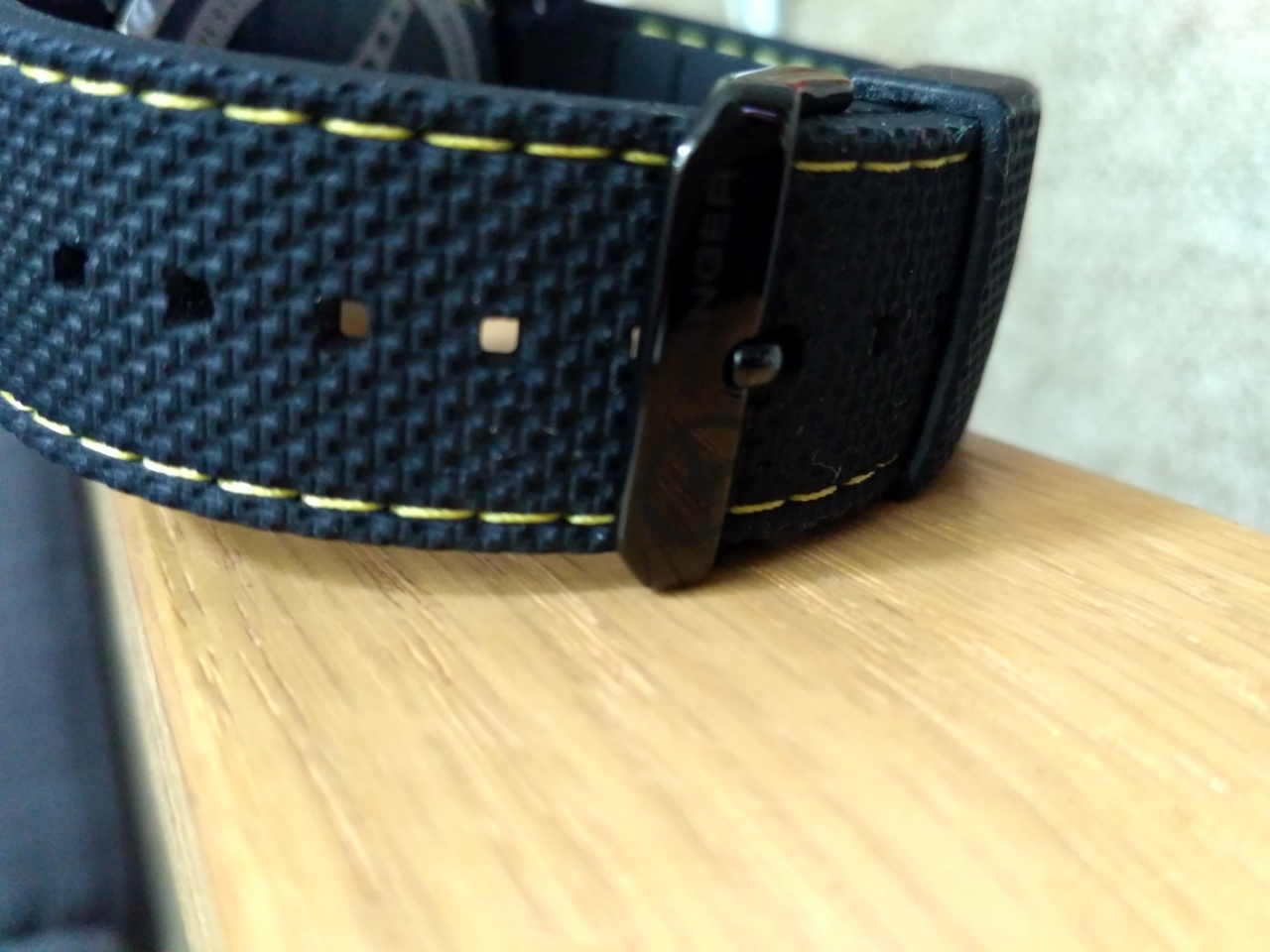 Ремешок резиновый, с прострочкой в цвет разметки. В моем случае - прострочка желтая. Ремешок плотно прилегает к корпусу закругленным торцом, создавая приятное ощущение монолитности. Я даже не стал пока менять на паракорд. Жду пока порвется резина, но, подожреваю, что ждать придется долго.