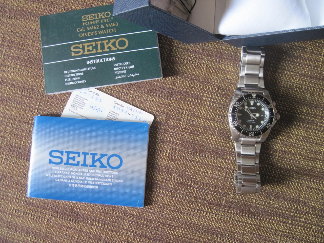Продам часы Seiko Kinetic SKA371P1 на браслете, сняты два звена, они в комплекте, вместе с инструкциями, карточкой гарантии(не уверен, что распространяется на РФ) и коробкой. Состояние: 4+ или 5-, кому как угодно. Носились мало, не ныряли. Безель и стекло в идеале, на браслете следы естественного ношения.