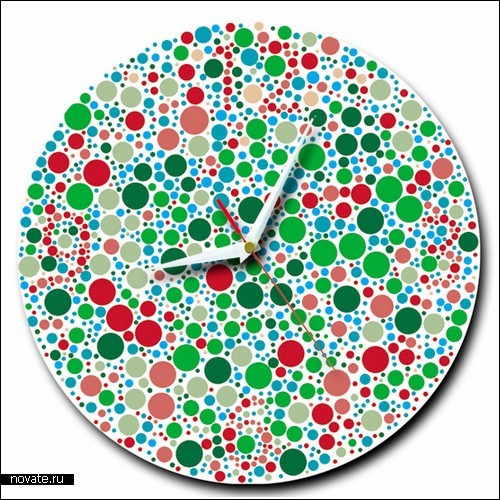 Взглянув на эти часы лишь разок, можно подумать, будто бы циферблат украшают простые разноцветные шарики. Кажется, что они только сбивают нас с мысли – по таким часам не то, что время не определишь, даже стрелку на них не видно, ведь она выполнена в белом цвете и почти сливается с фоном. На самом деле, дизайнеры из компании Sonodesign все очень хорошо продумали, и засекретили на циферблате сами цифры. Если приглядеться очень внимательно, мы увидим, что кружки превращаются в главные цифры на часах – три, шесть, девять и двенадцать.