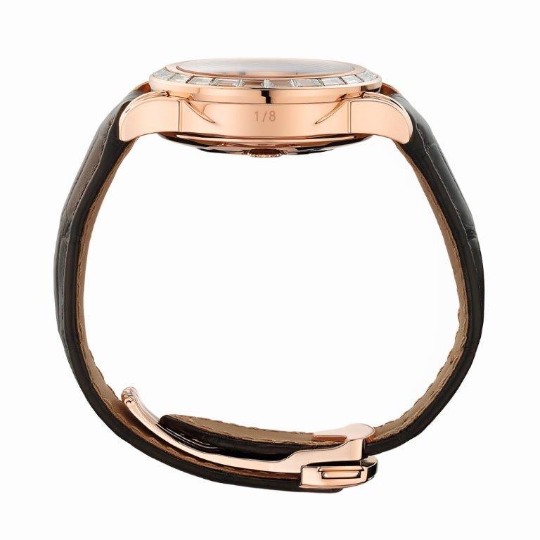 Отделка мостов и платин модели De Ville Central Tourbillon выполнена в шоколадно-коричневом цвете с использованием PVD. Матовая полировка мостов, имитирующая солнечное сияние, создает интересный рисунок и добавляет объем циферблату. Ротор автоподзавода, а так же мосты, выполнены из платины, и их полировка производится вручную. Корпус диаметром 38,7 мм, стрелки, винты и колеса, выполнены из 18-каратного розового золота. Безель часов украшен 24 бриллиантами багетной огранки.