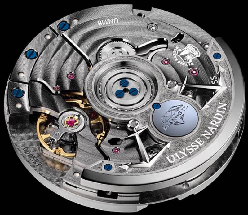 МЕХАНИЗМ: мануфактурный механический автоматический калибра UN-118 с алмазно-кремниевым спуском (DiamonSIL: кремний покрыт тонким алмазным слоем) не нуждающимся в смазке и отличающимся солидным сроком эксплуатации, а также кремниевой балансовой пружиной сертифицированый C.O.S.C и «Сертификат Ulysse Nardin», который гарантирует точность работы механизма, после того как он был встроен в корпус, а так же качество самого изделия в целом