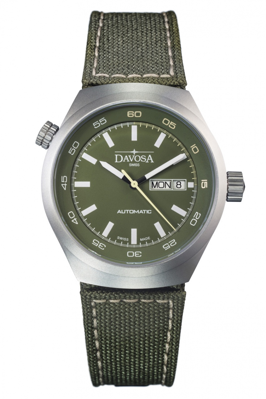 Круглый корпус новинки с матированным покрытием, изготовленный из нержавеющей стали, диаметром 42,0 мм или 47,0 мм, водонепроницаемый до 100 метров. На торце завинчивающейся рифленой заводной головки, расположенной на 3 часах, выгравировано изображение звезды - эмблемы бренда Davosa. Завинчивающаяся рифленая головка, управляющая движением вращающегося внутреннего кольца с минутной разметкой, размещена на 10 камнях. Сапфировое стекло установлено на передней стороне часового корпуса и на его завинчивающейся задней крышке. Циферблат синего, серого, черного или цвета хаки, с накладными часовыми индексами, покрытыми, как и часовая и минутная стрелка, люминесцентным составом белого цвета со светло-зеленым свечением в темноте.