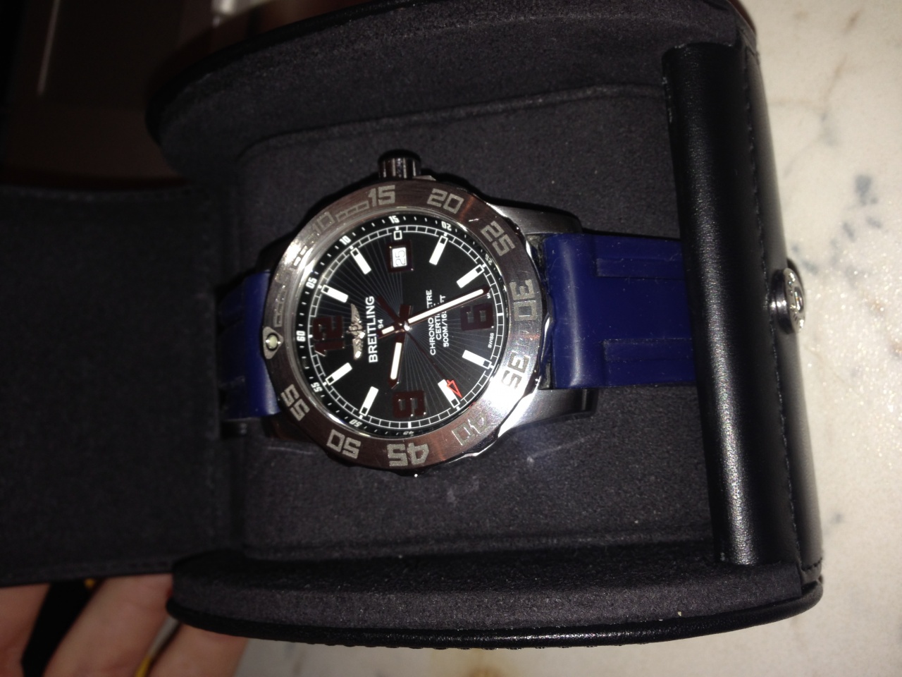 Продаю часы Breitling Colt 44мм А74387 с механизмом SuperQuartz™, на каучуковом темно-синем ремешке, также имеется оригинальный кожаный ремешок черного цвета. Приобретались 09.2013 у официального дилера, что подтверждено документами и коробкой. На корпусе имеются микро царапины от естественной эксплуатации, которые легко удаляются. Погрешность хода - 1 секунда в год. Носились очень аккуратно без ударов и падений.