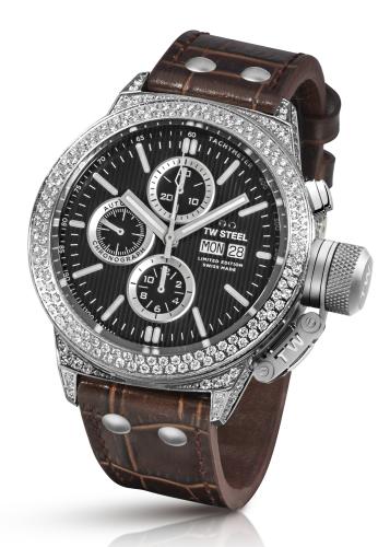 Круглый корпус новинки, изготовленный из нержавеющей стали, диаметром 45,0 мм, водонепроницаемый до 100 метров. На торце крупной завинчивающейся защищенной рифленой заводной головки, расположенной на 3 часах, выгравирован логотип бренда TW Steel. Пушеры хронографа размещены на 2 и 4 часах. Фиксированный безель, выполненный из нержавеющей стали, отделан в стиле Clous de Paris. Сапфировое стекло защищает матово-черный циферблат с вертикальными полосками, с часовыми индексами, часовой и минутной стрелками, покрытыми люминесцентным составом белого цвета. На периферии циферблата имеется круглая тахиметрическая шкала.