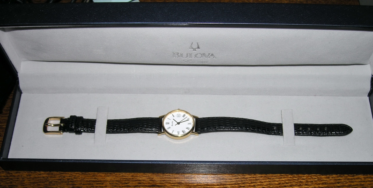 Продам в Москве золотые женские часы Bulova 14K Gold (по нашему 585 проба) ref. 95G05, кварц, диаметр 25мм, стекло сапфирофое, заводная головка с кабюшоном, состояние корпуса отличное без царапин и пр., жена их почти не носила, просто у нее потом появился Corum, а эти так и лежали в коробочке. Единственно что, приходит время заменить батарейку. Были куплены в США. Любая проверка.