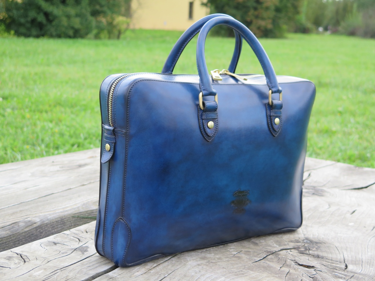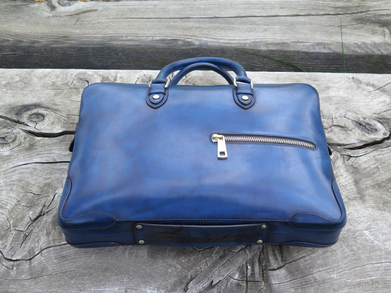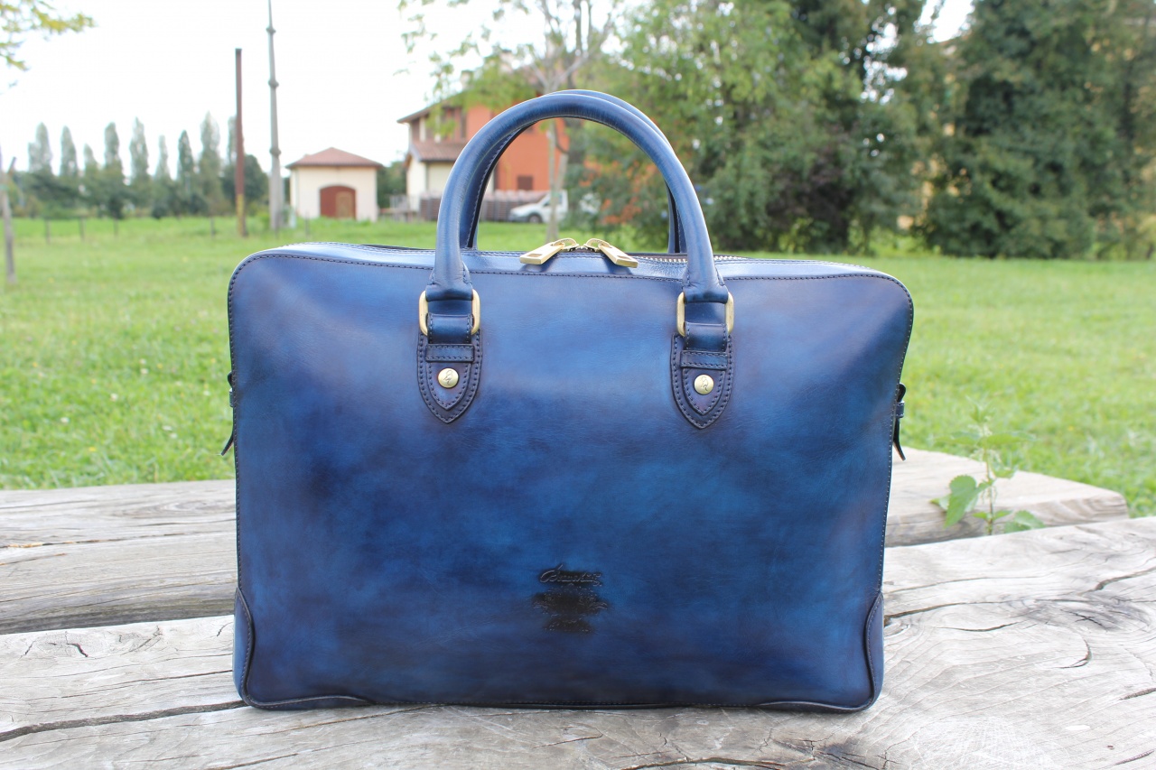 Мужская сумка–портфель ручной работы «Branchini» от легендарной болонской обувной мануфактуры «Branchini Calzoleria». Изготовлена из 100% телячьей кожи высочайшего качества выделки. Сумка окрашена полностью вручную в темно-синий цвет с эффектом патинирования «антик». Детали и декоративные элементы сумки изготовлены из оружейной латуни (молнии, бегунки, заклепки). Сумка застегивается на молнии с фирменными бегунками с изображением логотипа марки в виде буквы «B», и имеет снаружи отделение для небольших документов. С обратной стороны сумка имеет тесненное изображение логотипа марки «Branchini Calzoleria» в виде герба. Внутренняя часть сумки изготовлена из кожи тёмно–бежевого цвета, и имеет одно большое отделение для переноски ноутбука, документов и прочих вещей, дополнительное отделение на молнии для хранения сотового телефона, бумажника, паспорта и прочих документов, и два дополнительных отделения.