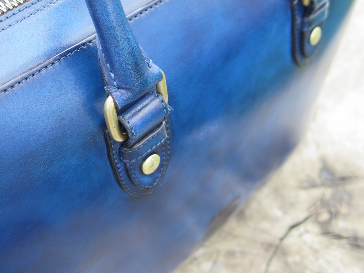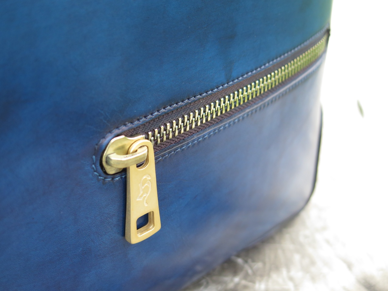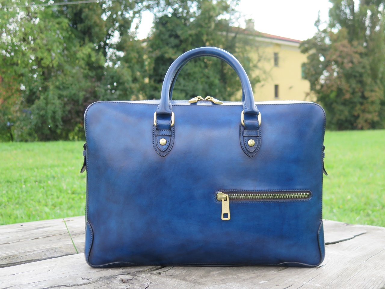 Мужская сумка–портфель ручной работы «Branchini» от легендарной болонской обувной мануфактуры «Branchini Calzoleria». Изготовлена из 100% телячьей кожи высочайшего качества выделки. Сумка окрашена полностью вручную в темно-синий цвет с эффектом патинирования «антик». Детали и декоративные элементы сумки изготовлены из оружейной латуни (молнии, бегунки, заклепки). Сумка застегивается на молнии с фирменными бегунками с изображением логотипа марки в виде буквы «B», и имеет снаружи отделение для небольших документов. С обратной стороны сумка имеет тесненное изображение логотипа марки «Branchini Calzoleria» в виде герба. Внутренняя часть сумки изготовлена из кожи тёмно–бежевого цвета, и имеет одно большое отделение для переноски ноутбука, документов и прочих вещей, дополнительное отделение на молнии для хранения сотового телефона, бумажника, паспорта и прочих документов, и два дополнительных отделения.