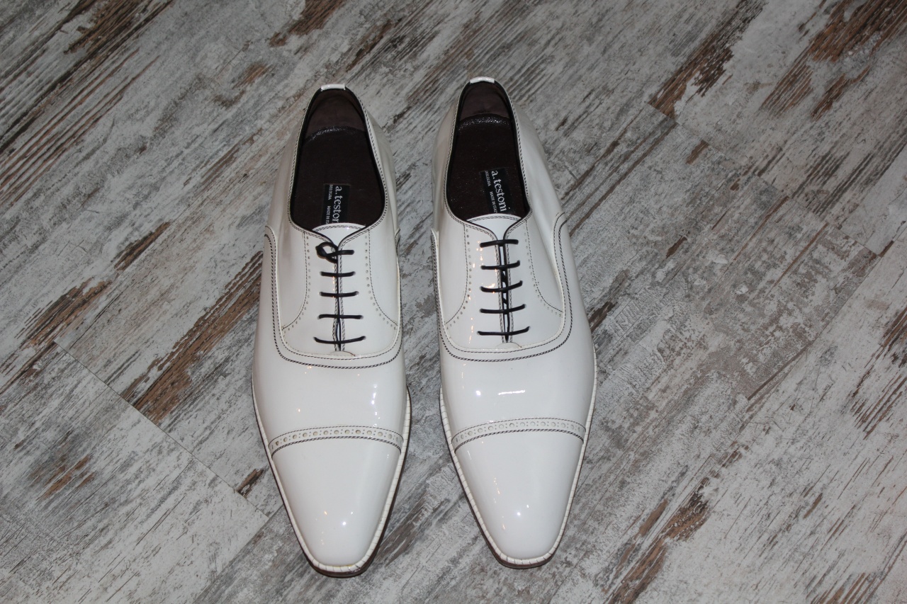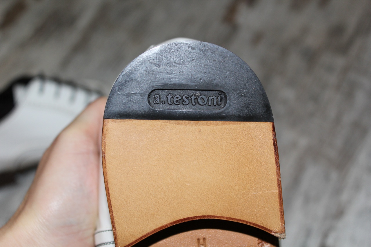 Продаю очень красивые классические мужские ботинки от знаменитой итальянской обувной мануфактуры a.testoni на шнурках. Цвет: белый. Ботинки изготовлены из 100% лакированной телячьей кожи высочайшего качества выделки. Подошва из натуральной кожи. По ранту подошвы ботинки имеют фирменное декоративное украшение a.testoni в виде плетенной косички.