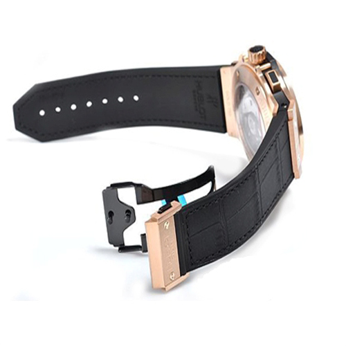 Модель представляет собой скелетон в подчеркнуто современном исполнении, сочетающий в себе разнообразные материалы и технологии. К корпусу из розового золота 18K прикручен фирменными Н-образными винтами керамический безель из золота 18K. Счетчики часов и минут традиционно расположены у отметок «6 часов» и «3 часа», а циферблат малой секундной стрелки находится в положении «9 часов». Между отметками "4" и "5 часов" размещается небольшое окошко с датой. Под задней крышкой из сапфирового стекла движется скелетированный ротор автоподзавода с черным PVD-покрытием. Хронограф работает на автоматическом калибре HUB 4214. Модель комплектуется комбинированным чёрным ремешком из кожи аллигатора и каучука.
