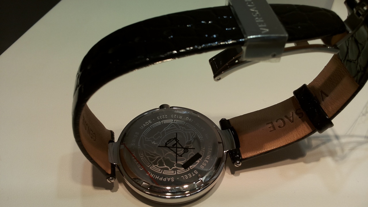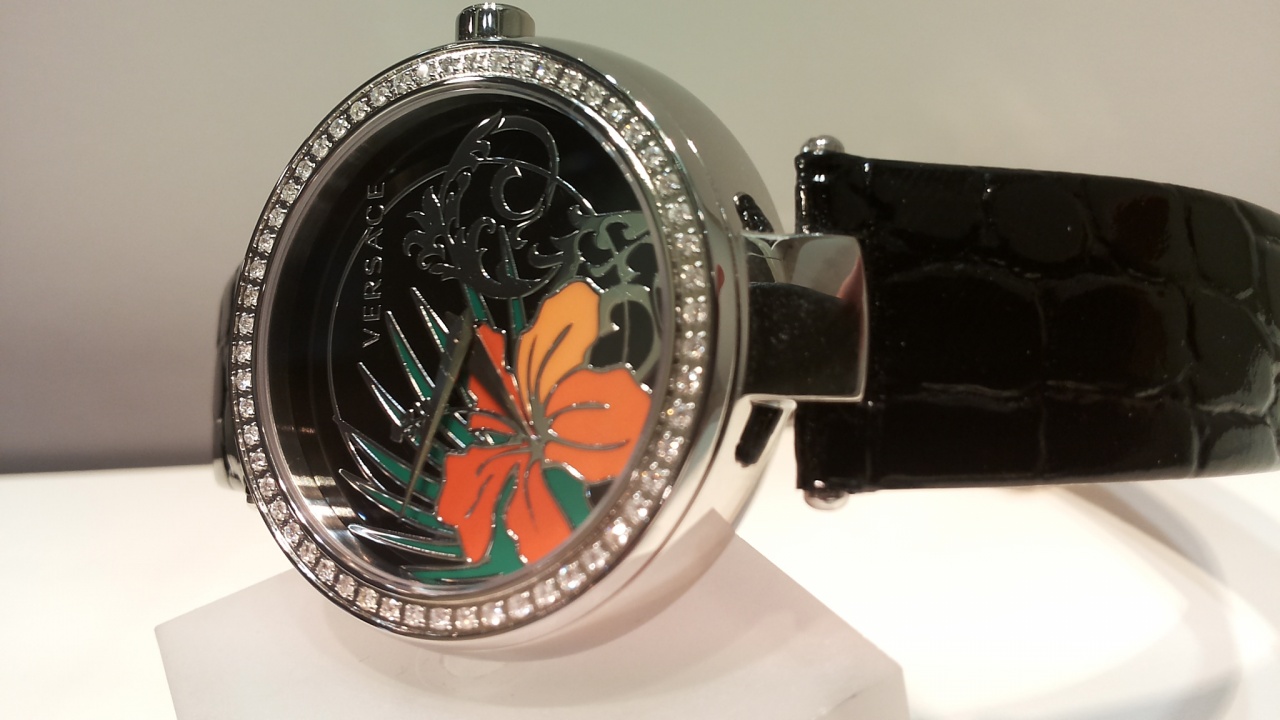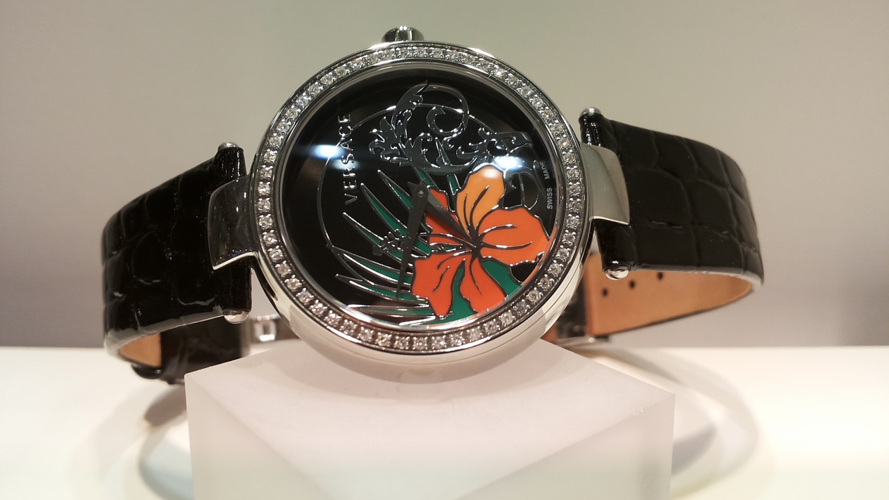 Циферблат: черный, декорация в стиле барокко, цветок гибискус, логотип Versace