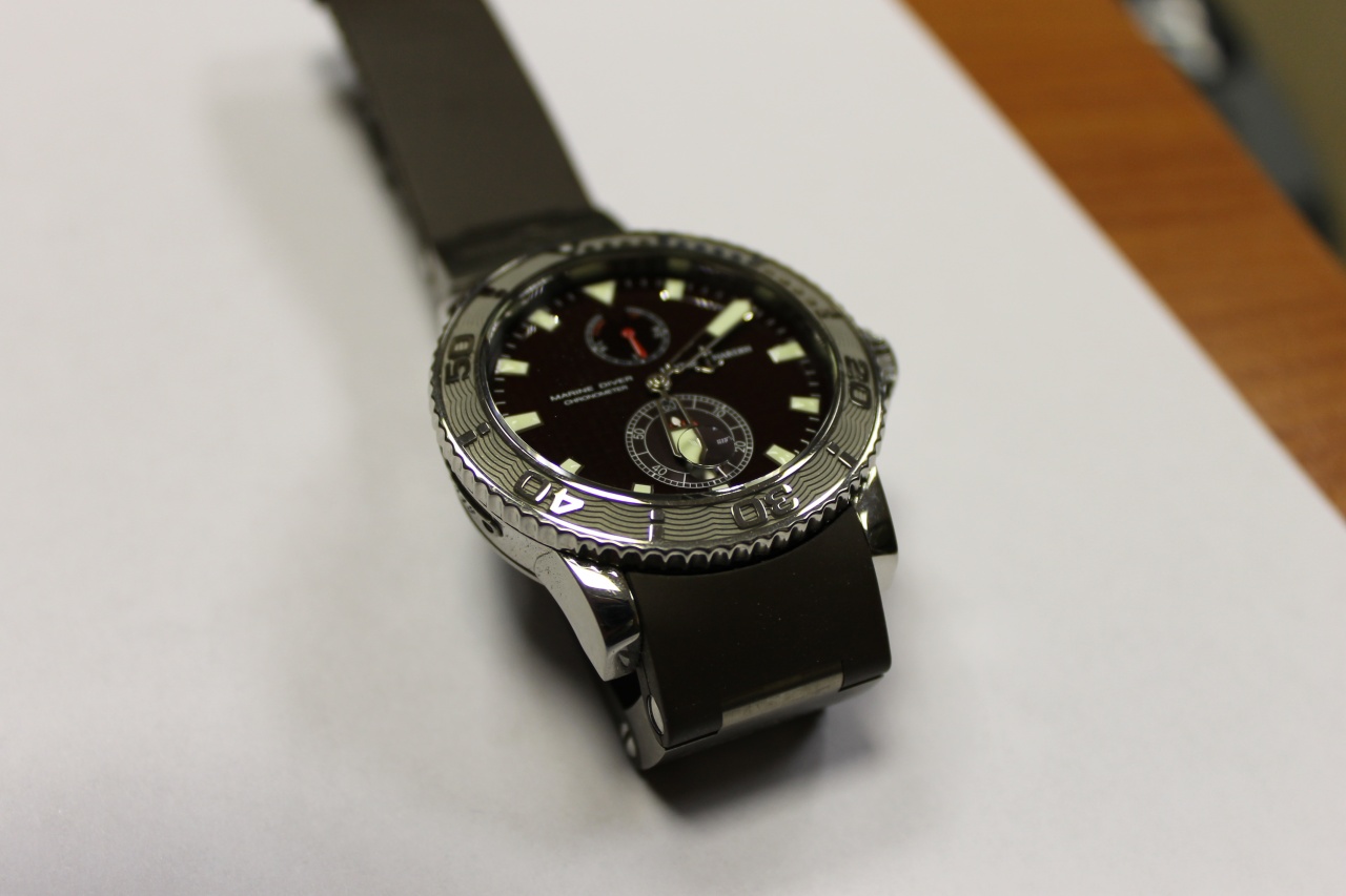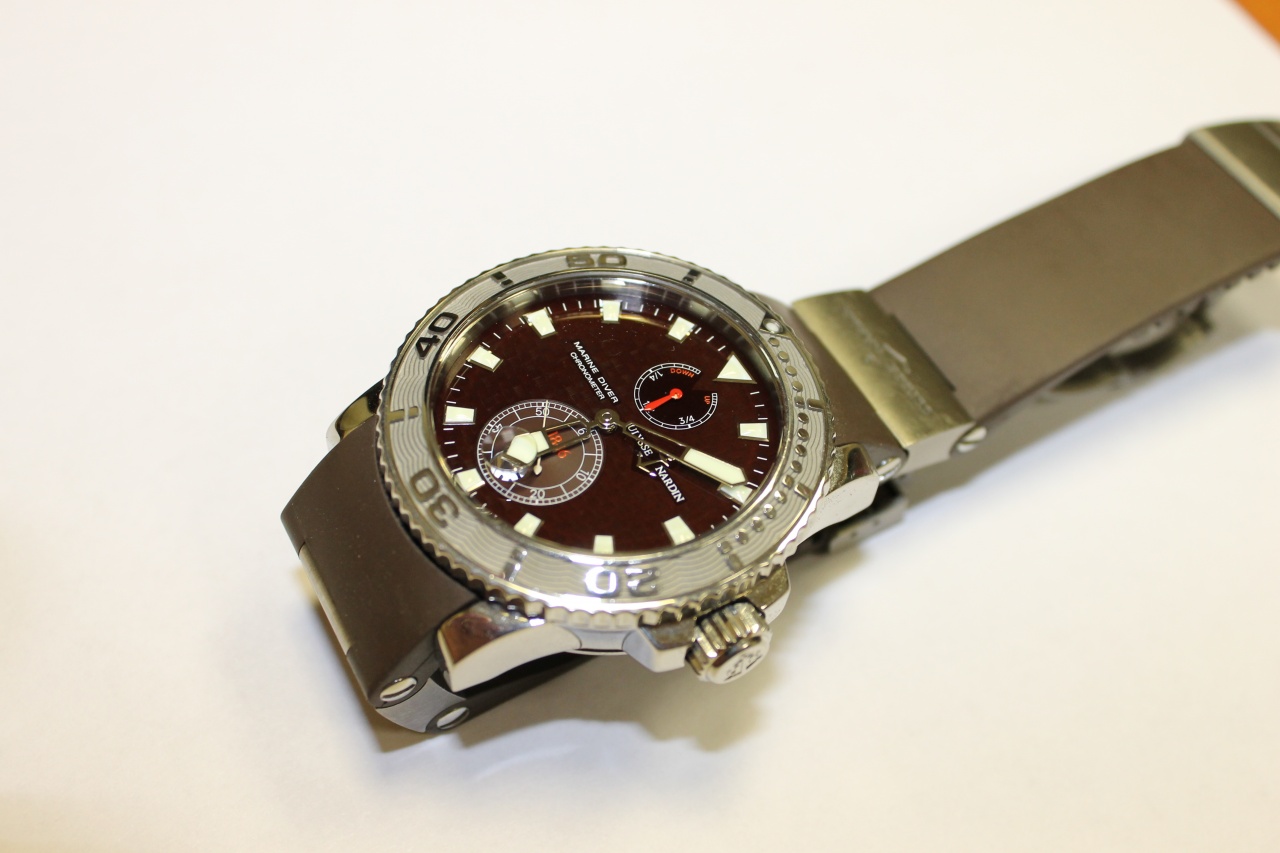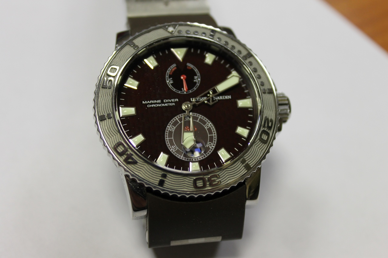Уважаемые форумчане! Предлагаю Вашему вниманию часы Ulysse nardin Maxi Marine Diver. Куплены за границей в официальном магазине в 2010 г. Коричневый циферблат (цвет бургундия), оригинальный коричневый каучук (обрезан под обхват руки 19 см). Размер корпуса 42,7 мм., корпус сталь, стекло сапфир, механика с автоподзаводом, водонепроницаемость 300 м. Работают идеально, состояние отличное, носились аккуратно, есть незначительные следы носки на титановых вставках и каучуке. В комплекте коробка и документы. Цена 165000 руб.