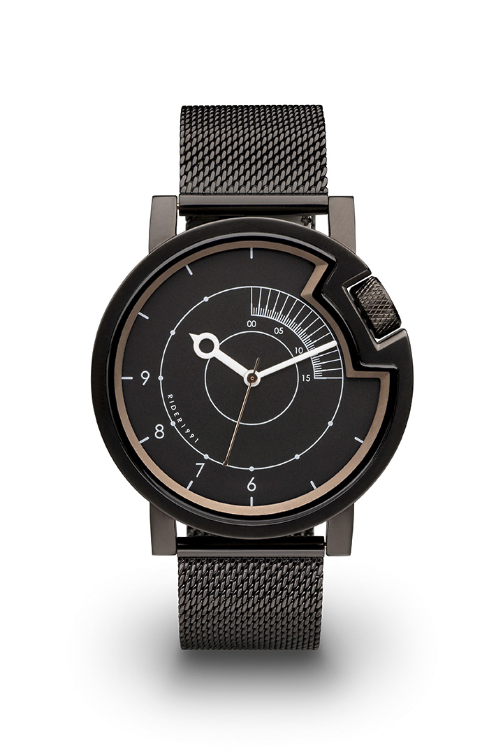 В результате работы над дизайном часов были выбраны 5 моделей RIDER1991 в таких вариациях: черный или белый циферблат с алюминиевыми внутренними кольцами - черным, серебряным или в розовом золоте. Ремешки кожаные или Mesh Strap разных цветов.