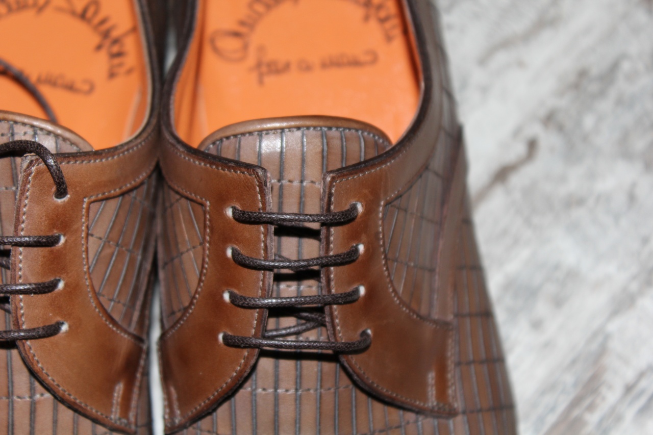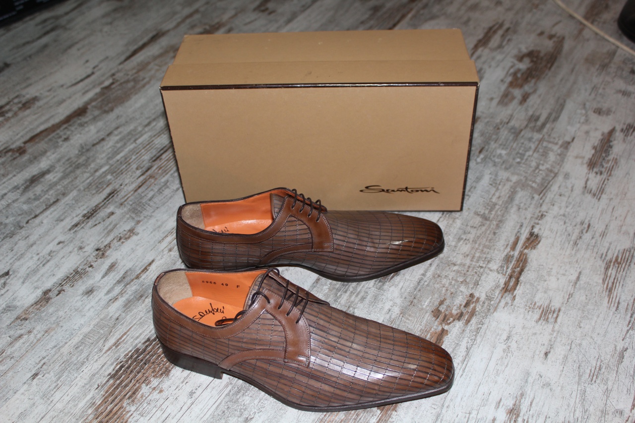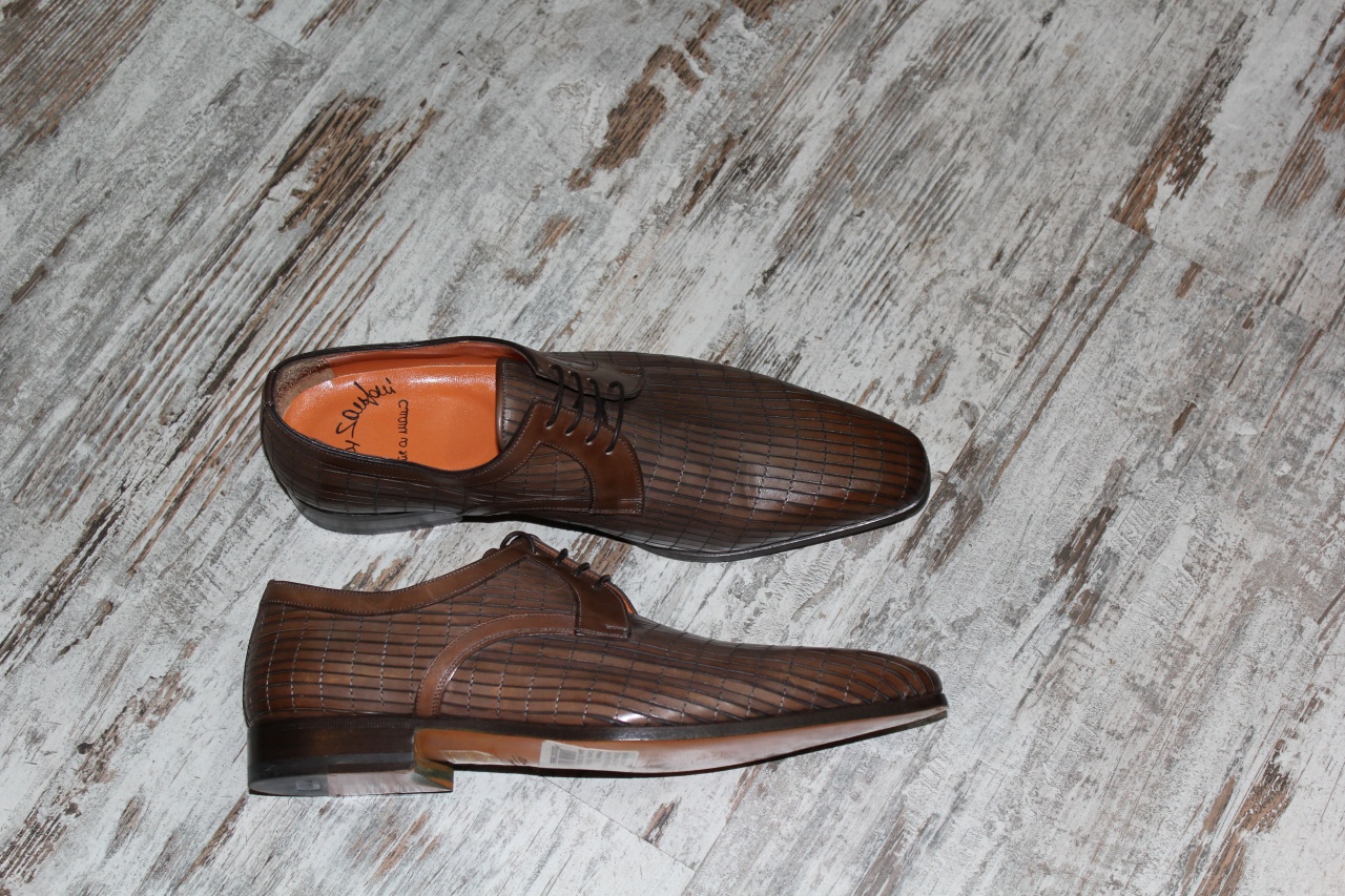 Продаю классические мужские ботинки Santoni на шнурках, изготовлены из 100% кожи высочайшего качества выделки, порезанной на полоски и прошитой таким образом, что образуется рисунок в виде прямоугольников, и имеющей градиентную окраску в «коричневый/тёмно-коричневый» цвет с эффектом патинирования «антик», выполненную вручную. Подошва из натуральной кожи, укреплена бронзовыми гвоздиками, Каждая пара ботинок снабжена фирменными мешками для хранения обуви.
