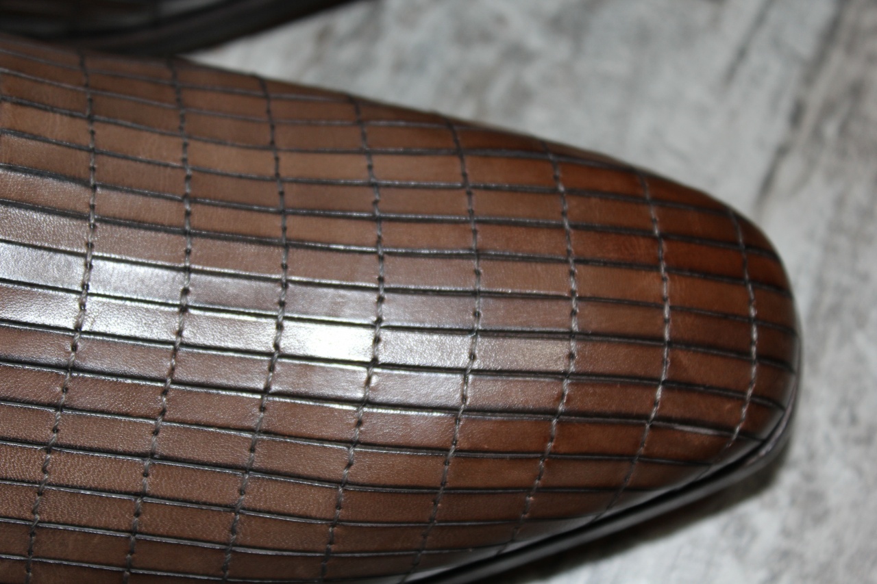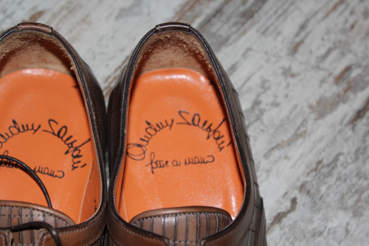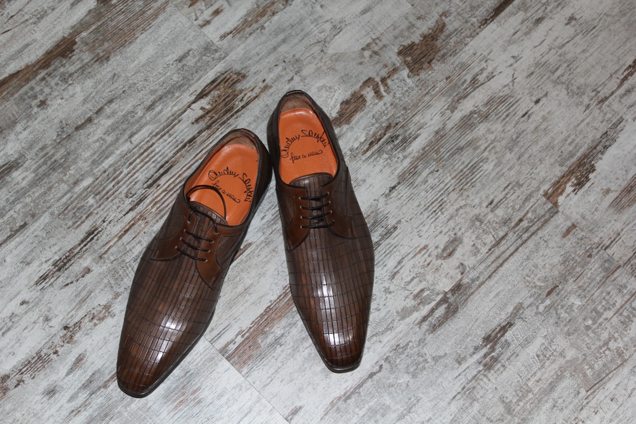 Продаю классические мужские ботинки Santoni на шнурках, изготовлены из 100% кожи высочайшего качества выделки, порезанной на полоски и прошитой таким образом, что образуется рисунок в виде прямоугольников, и имеющей градиентную окраску в «коричневый/тёмно-коричневый» цвет с эффектом патинирования «антик», выполненную вручную. Подошва из натуральной кожи, укреплена бронзовыми гвоздиками, Каждая пара ботинок снабжена фирменными мешками для хранения обуви.