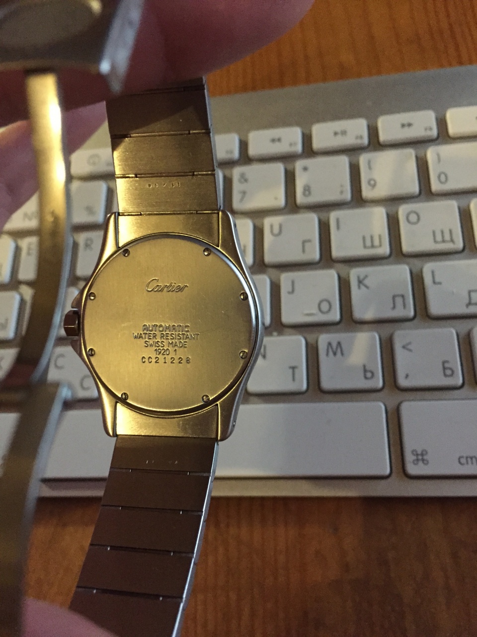 ref.1920-1 Ультратонкий Картье механика-автомат.Ход точный-проведена профилактика полгода назад. Сапфир без царапин. На бакле потерян знак бренда-по восстановлению утери,думаю, можно обратиться в бутик Картье. Диаметр 33мм без головки. Фото на моей руке Браслет убавлен на одно звено(утеряно).Продажа без коробки и бумаг
