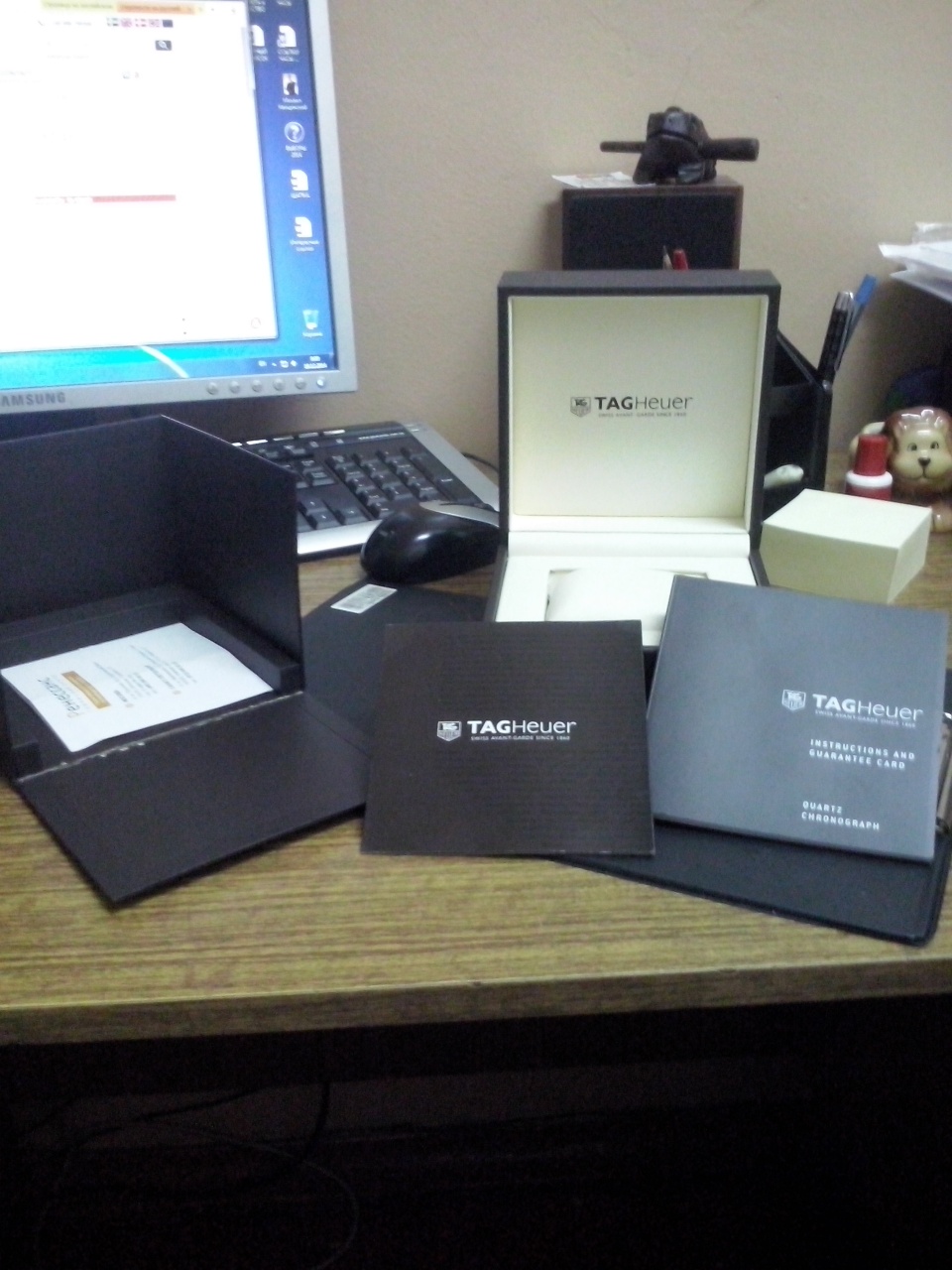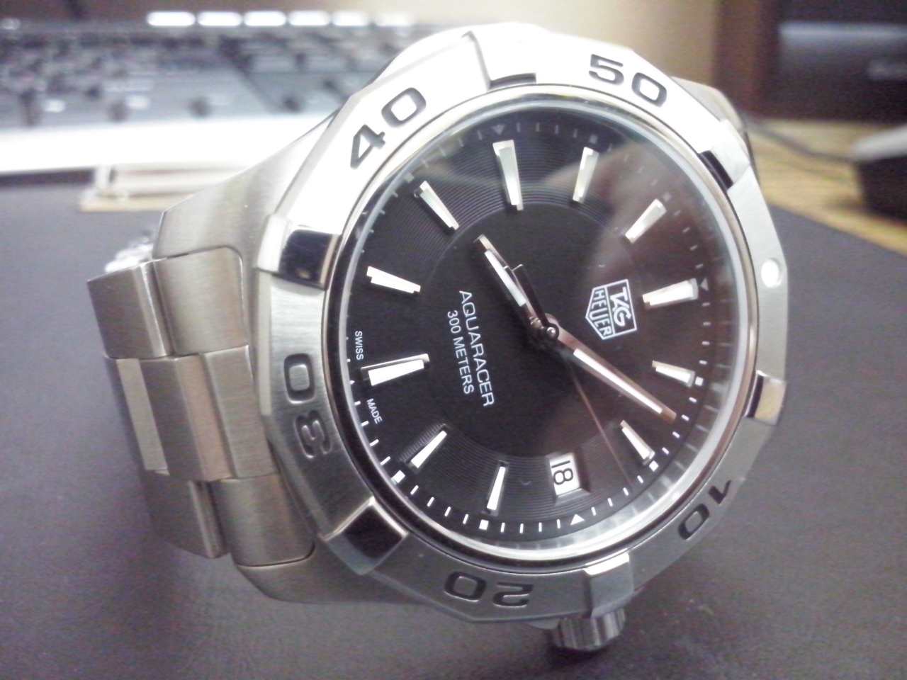 Уважаемые форумчане! В продаже TAG Heuer Aquaracer WAP1110.BA0831. Давно присматривался к этой марке. Не шайба и не мелочь, сапфир (защищен «красивограненым» безелем, вращающимся с приятными щелчками- люфтов, ничего неприятного нет, метки попадают идеально), водозащита 300 м, кварц Механизм ETA F06.111. Индикация числа. Люминесцентные стрелки и часовые метки. Стальной корпус. Диаметр 39мм, толщина 10мм. Коробка-упакован в белый картон, в ней обычная коробка с крышкой с логотипом Таг…снимаем крышку, под ней еще коробка. Внутри на сливочном цвета кожзаме часы… Создают впечатление монументальности и основательности, стекла как будто нет совсем-сапфир. Стрелки и метки из полированного металла, что мне понравилось, секундной стрелки иногда под определенным углом не видать…Идут в «ноль», что порадовало-точность очень уважаю. Для перфекционистов- стрелки ровнехонько попадают в метки. Браслет в основном сатинированный, с ярко выраженными гранями, лишь края звеньев полированные…Застежка широкая, длинная, надпись выведена очень четко и кажется дорого выглядящей, если можно так сказать (выведена лазером). Браслет порадовал негремучестью, руку не эпиллирует, очень и очень комфортный. Все звенья, в том числе и концевые, конечно же, литые, к корпусу примыкание идеальное просто. Достаточно увесистые, но и не тяжелые, при этом форма позволяет очень хорошо устроить на руке и при своих 40 мм выглядеть немаленькими. На крышке изображение шлема от тяжелого скафандра водолаза и соответствующие техническим характеристикам надписи.