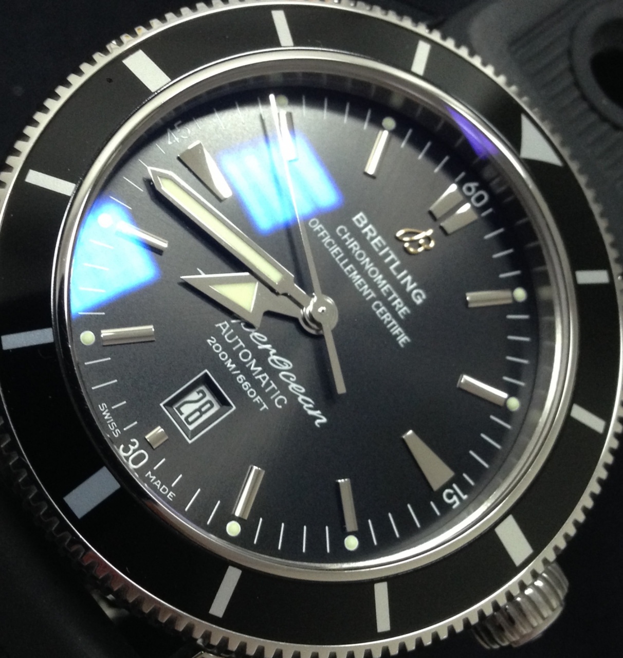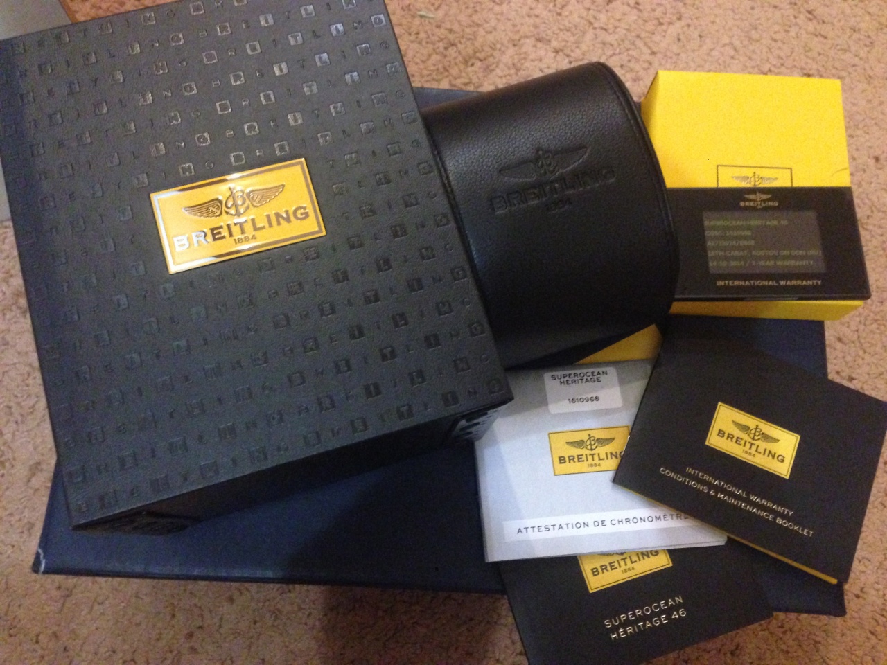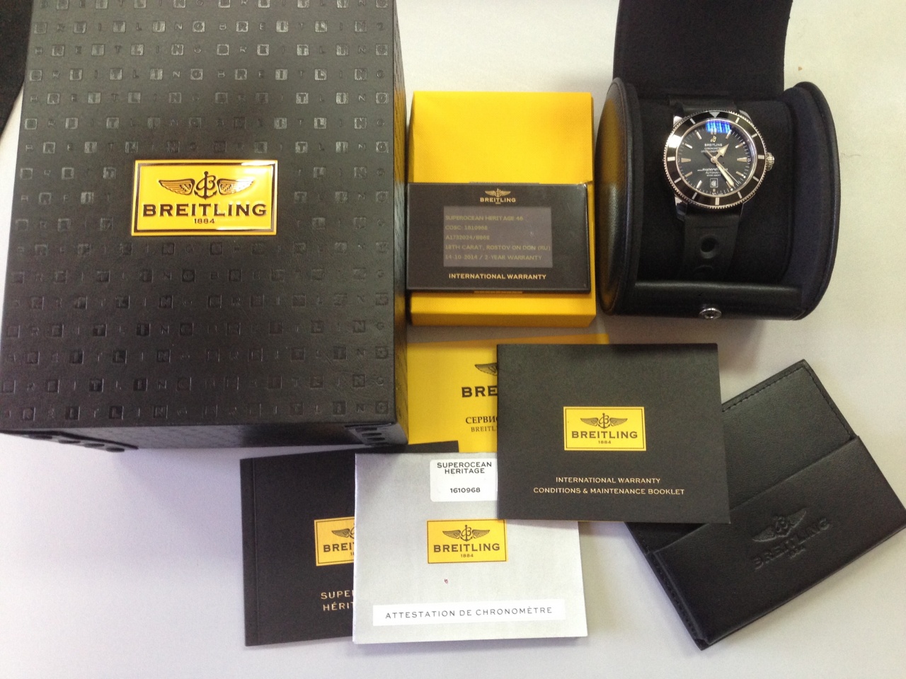 Часы куплены в октябре 2014г., у официального ретейлера - магазин "18 карат", г.Ростов-на-Дону...документы, чеки и коробка в наличии, гарантия 2 года...состояние близко к идеальному ( как новые). Все фото сделаны именно с этих часов. Часы из последних поставок, с электронной международной гарантией, которая активируется при продаже и информация отправляется в компанию BREITLING.