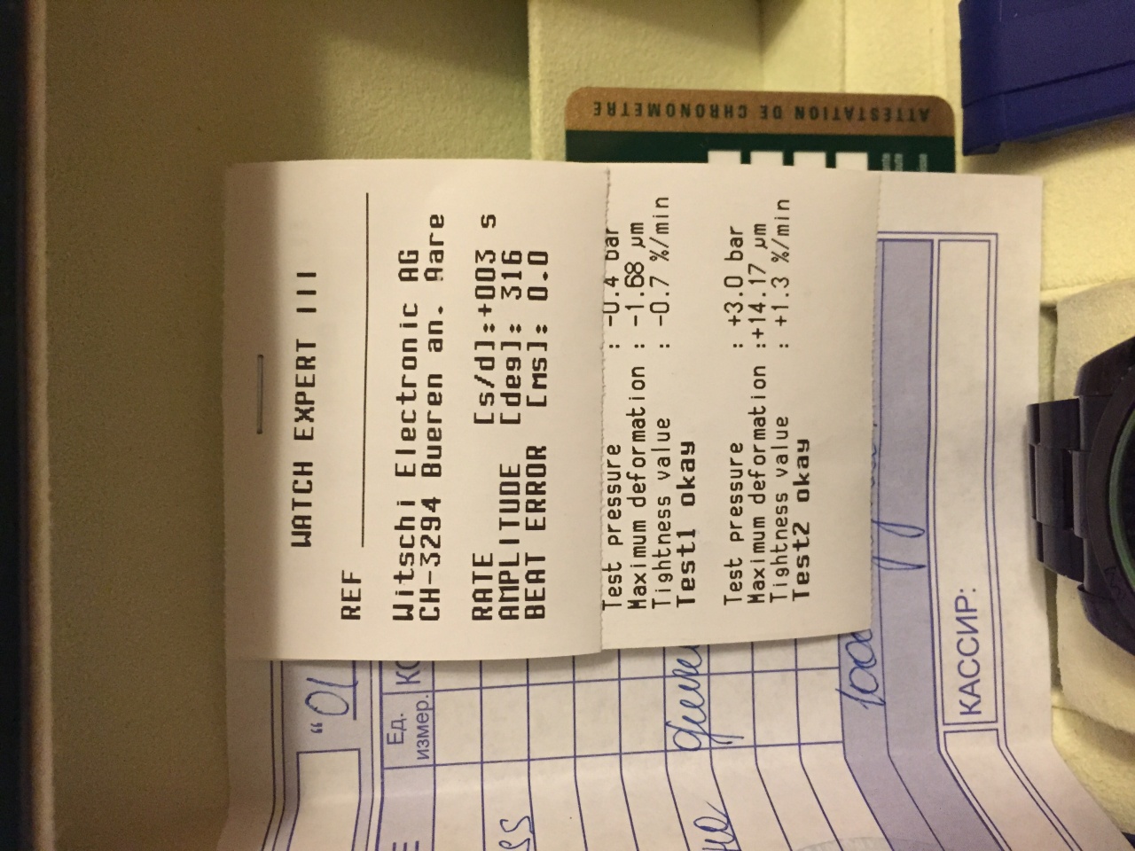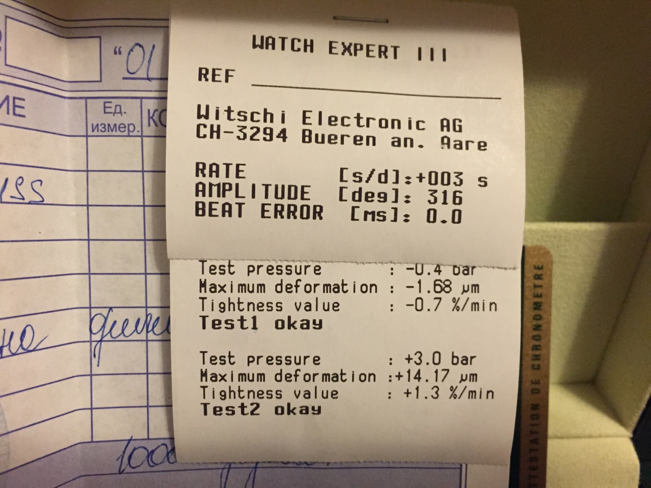 01.12.14 произведены замеры: Точности хода и Водонепроницаемость в Московском Часовом Центре на Денежном пер. д.1 (фото).