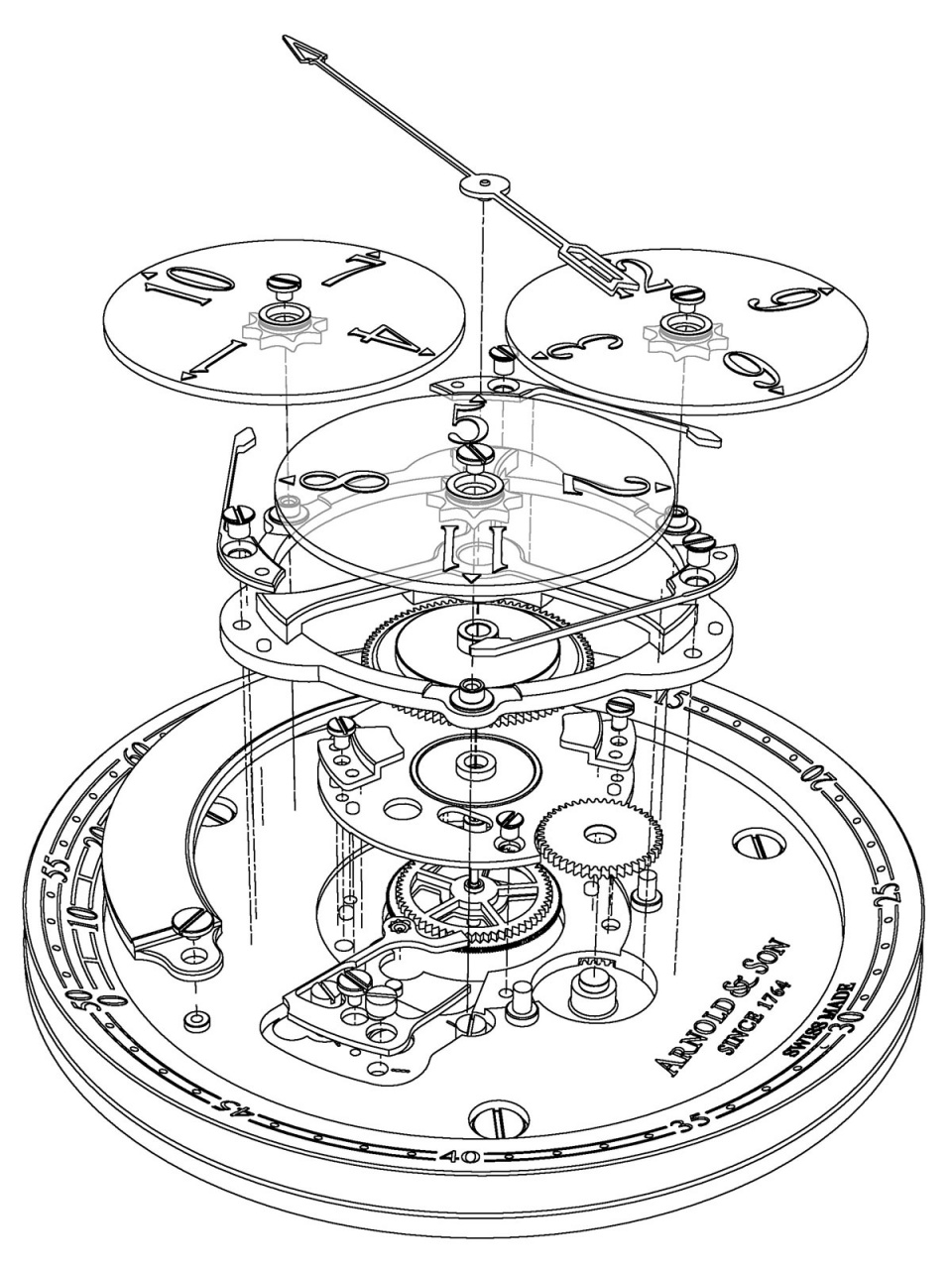 Модель оснащена мануфактурным швейцарским автоматическим механизмом Arnold & Son A&S6018, на 29 камнях, с балансовой частотой 28800 полуколебаний в час (4 гц), 50-часовым запасом хода, функциями индикации часов (посредством вращающегося золотого колеса с тремя сапфировыми дисками, с нанесенными на них золотыми арабскими цифрами, каждый из которых, в свою очередь, вращается вокруг своих собственных осей), минут (посредством передвигающейся по минутной шкале, расположенной между 10 и 2 часами, очередной арабской цифры на очередном вращающемся сапфировом диске) и секунд, с усложнением "мертвая секунда" (реализуемым посредством соответствующей золотой центральной секундной стрелки). Калибр выполнен из палладия, вручную отделан и декорирован в соответствии с критериями Haute Horlogerie.