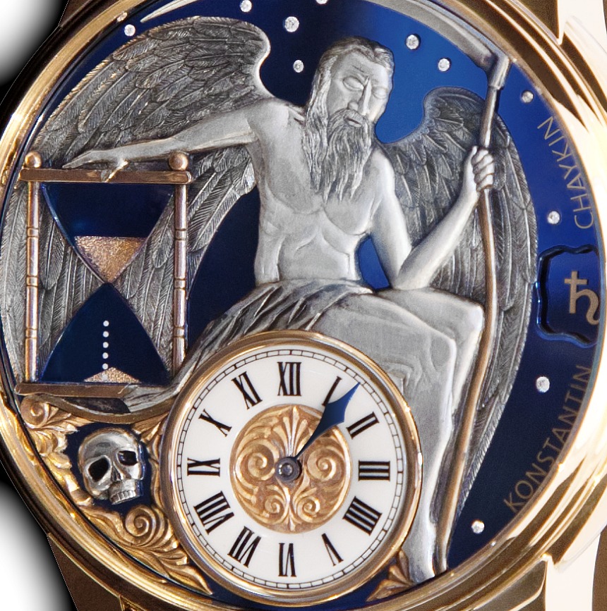 Его образ живой и выразительный. Задумавшийся Хронос с изрезанным глубокими морщинами лбом восседает на миниатюрном циферблате с единственной часовой стрелкой.