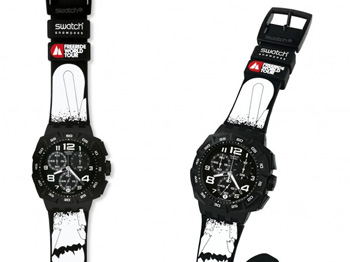 Марка швейцарских часов Swatch к третьему сезону Мирового Фрирайд Тура создала черно-белые часы-ски-пасс - Chrono Plastic Snowpass, которые могут заряжаться, как магнитные карты и выполнять функцию скипасса.