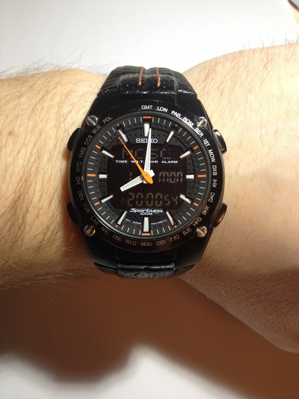 SEIKO Sportura SNJ011P2 / аналог+цифра / стальной титан на коже с мировым временем!