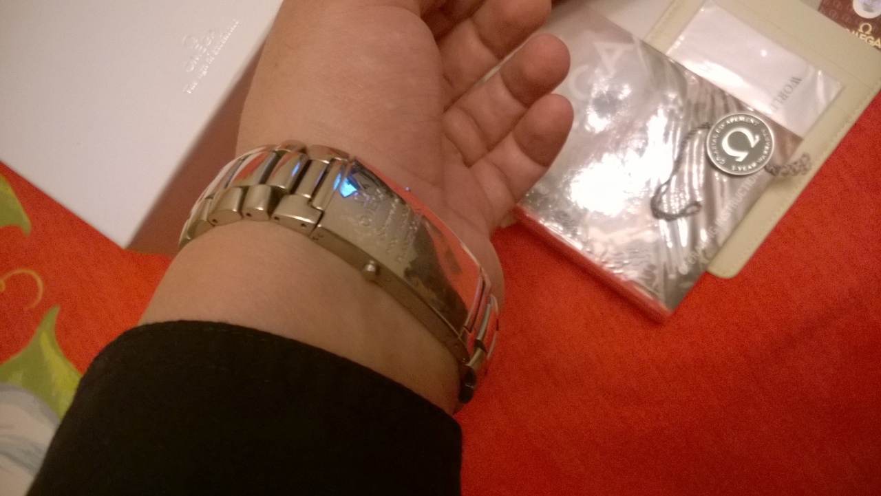 Браслет на немаленькую руку + доп. звено. В комплекте часы, наруж. и внутр. коробки, мануал, портмоне для карточек, не заполненная карта, бейдж.