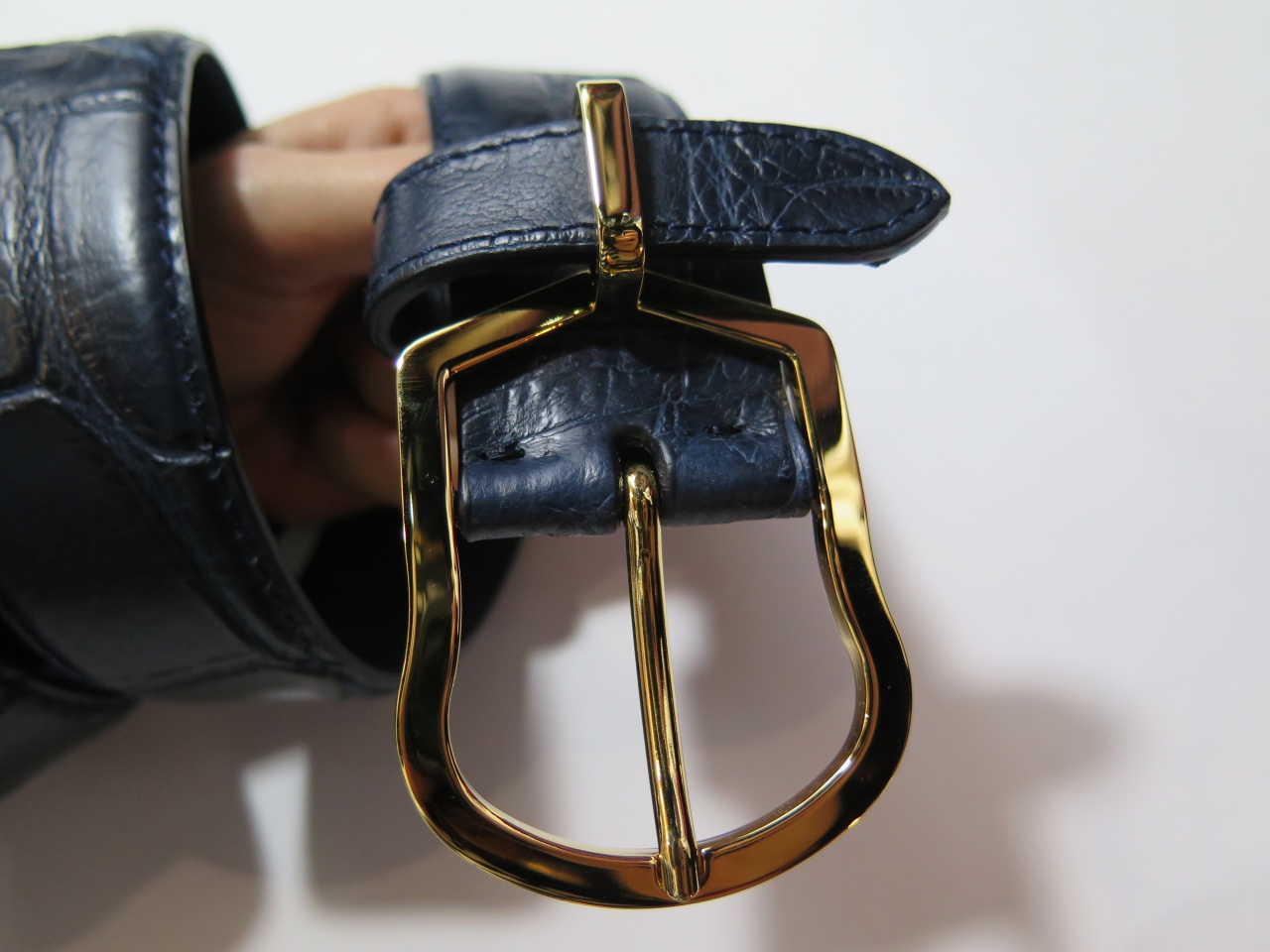 Мужской ремень ручной работы Brianza, изготовлен из 100% кожи крокодила высочайшего качества выделки. Цвет темно-синий. Прямоугольная пряжка запатентованной конструкции изготовлена из никеля, покрытого палладием. Крепление пряжки ремня на одном съемном болте, позволяет легко укорачивать ремень до нужного размера. Толщина ремня составляет 4,0 см., что позволяет носить его как с брюками, так и с джинсами.