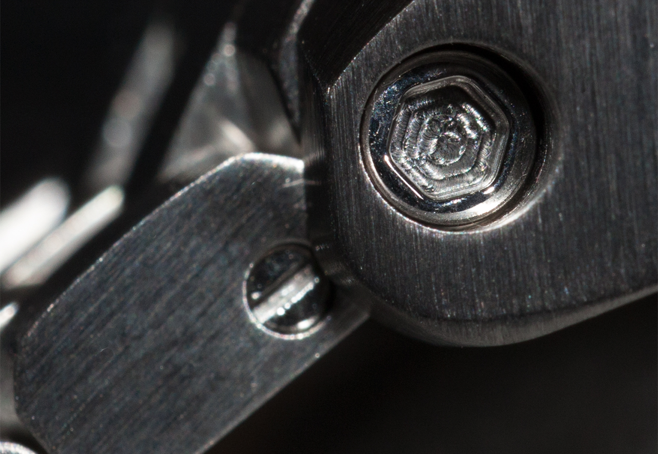 Затем берём в руки фотоаппарат с макрообъективом и начинаем "ловить блох". А их-то и нету особо, есть только претензия к качеству обработки внутри шестигранника для смены браслетов, да и то со стороны это смотрится, как печать, а не как дефект, вживую намного симпатичнее