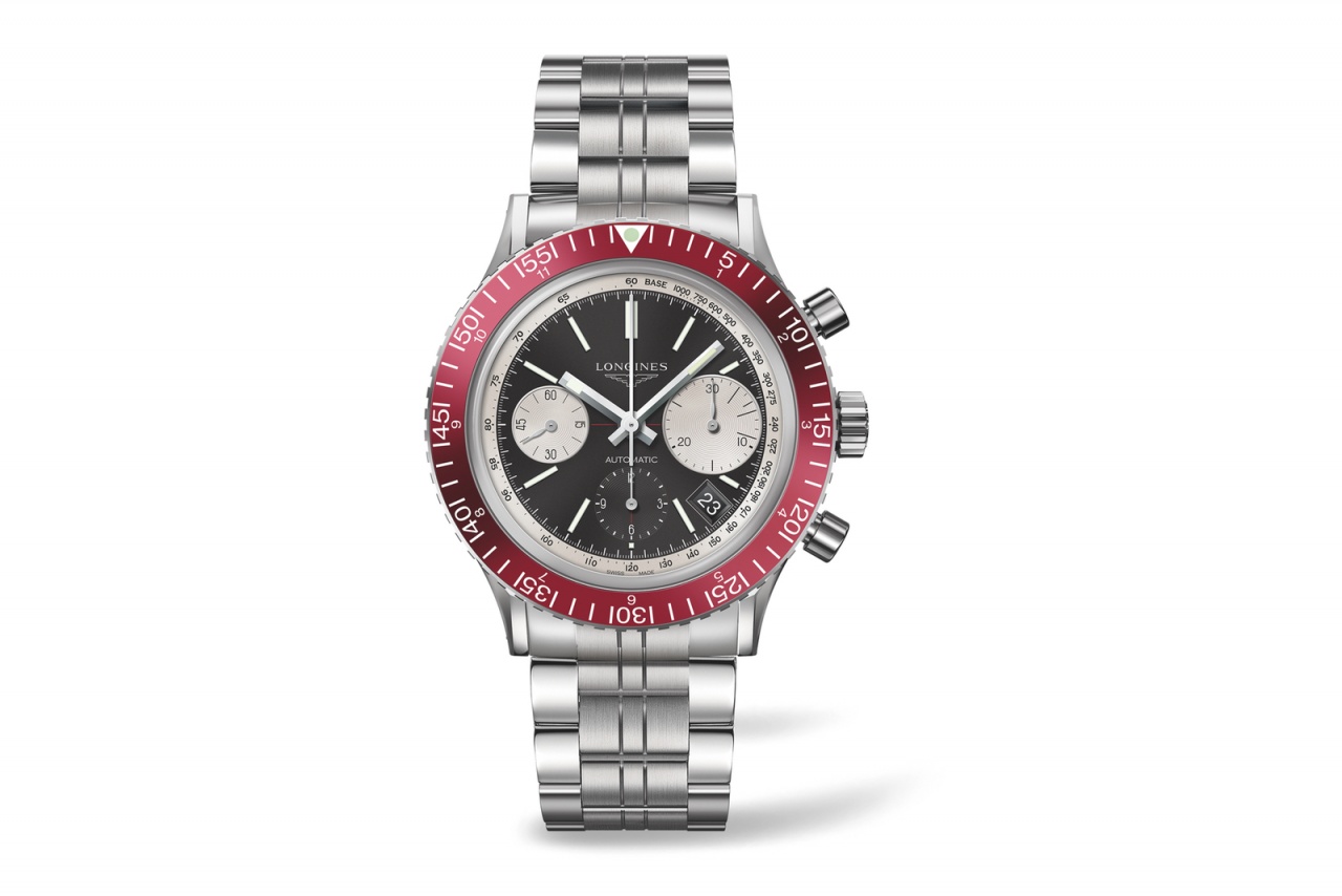 Круглый корпус изготовлен из нержавеющей стали, диаметром 42,0 мм, водонепроницаемый до 300 метров. На торце рифленой завинчивающейся заводной головки, расположенной на 3 часах, выгравировано наименование и эмблема бренда Longines. Пушеры хронографа размещены на 2 и 4 часах. Вращающийся однонаправленный дайверский безель с темно-бордовым покрытием. На завинчивающая задняя крышке гравированная. Циферблат матово-черного цвета, с накладными продолговатыми часовыми индексами, покрытыми, как и часовая и минутная стрелки, люминесцентным составом белого цвета. На периферии циферблата нанесена тахиметрическая шкала.