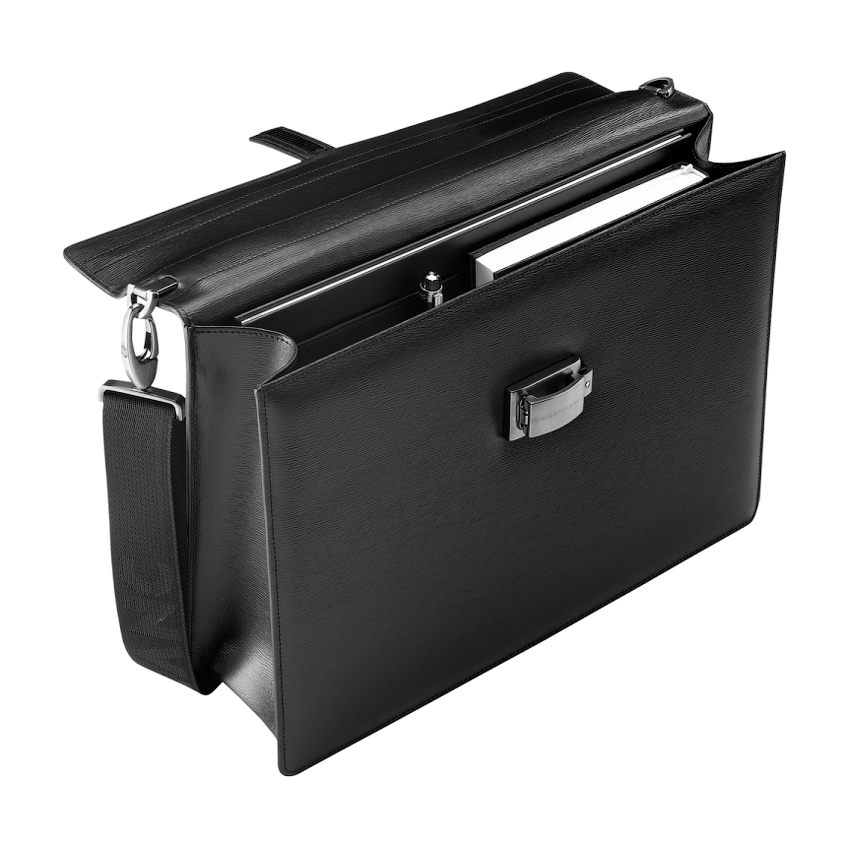 Портфель черного цвета, из высококачественной кожи хромового дубления с фактурным рельефным узором. Жаккардовая подкладка с логотипами Montblanc. Фурнитура из металла с полу-матовым рутениевым покрытием. Плечевой ремень с логотипами Montblanc.