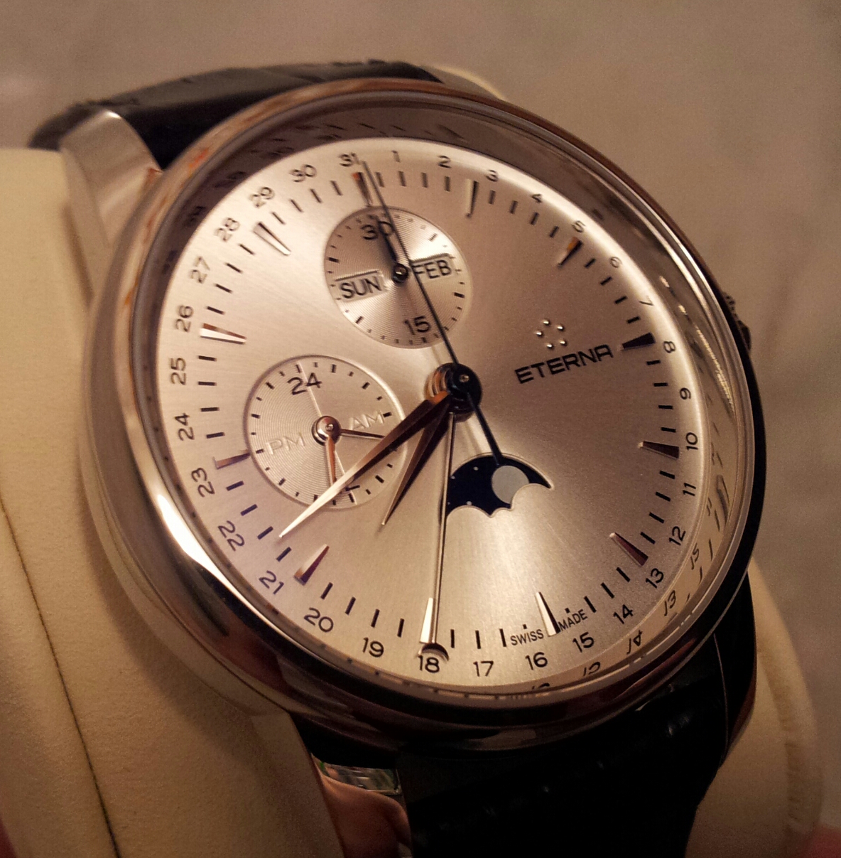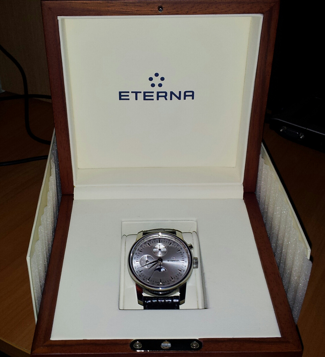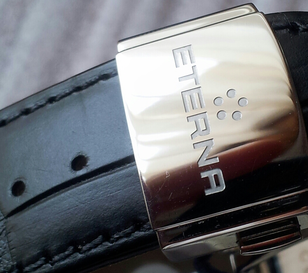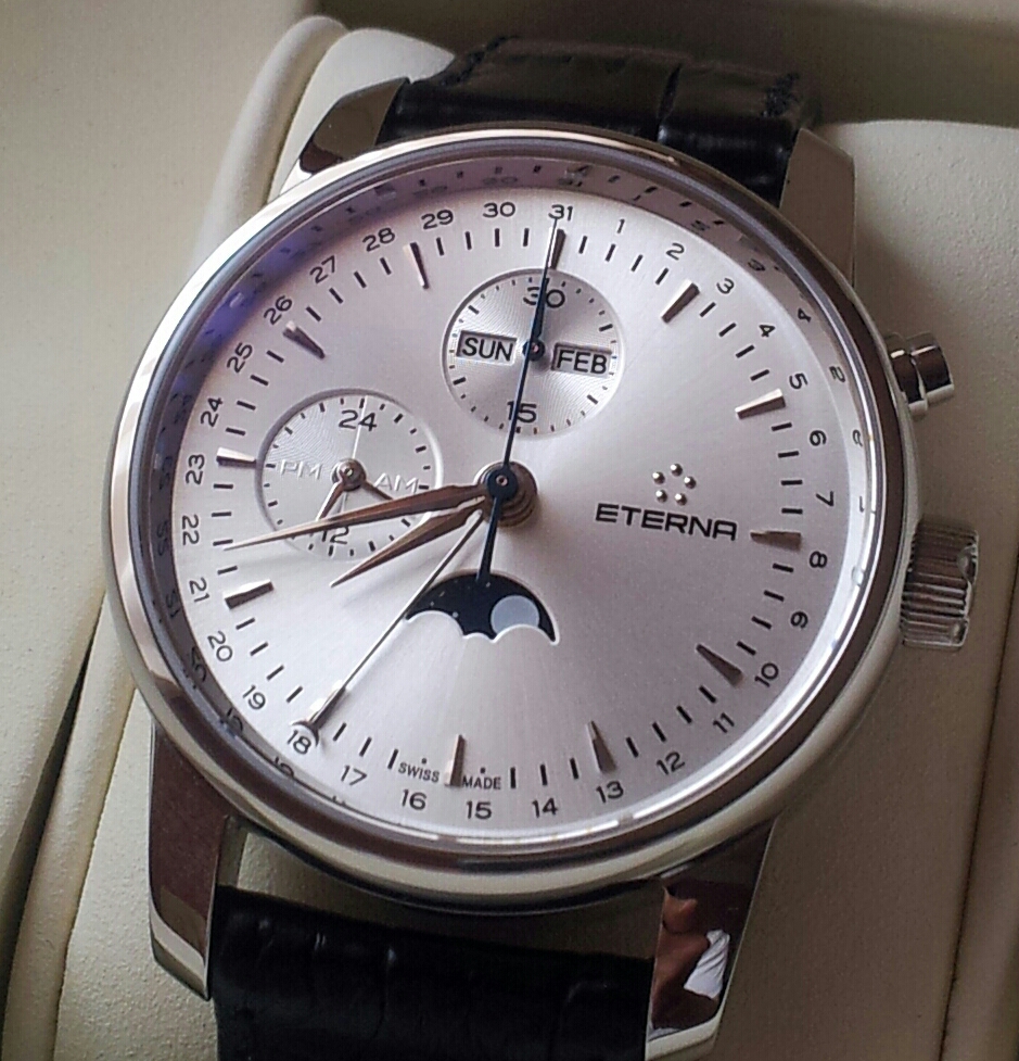 Однокнопочный хронограф Eterna Soleuer Moonphase Monopusher Chronograph на базе доработанного и усложненного для управления одной кнопкой механизма Valjoux 7751 (25 камней, запас хода 48 часов). На цифере указатели дня недели и месяца, времени суток и даты в ретроградном стиле. Корпус 42 мм. Стекло сапфировое с двойным антибликом. Водозащита 50 м. Ремень из кожи аллигатора номерной ручной работы. Застежка фирменная Eterna. в комплекте две коробки - деревянная для часов и из плотного картона с логотипом для первой и документов. Часы в идеальном состоянии, одевались несколько раз по случаю. Точность хода + 1 сек. в сутки.