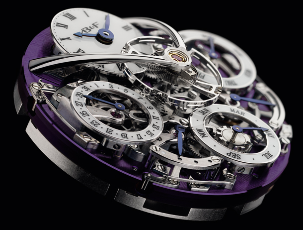 В положении «12 часов», между изысканно изогнутыми арками баланса, находятся часовая и минутная стрелки. Далее по часовой стрелке: индикатор дней недели на отметке «3 часа», индикатор запаса хода («4 часа»), месяца («6 часов»), ретроградный индикатор високосного цикла («7 часов») и указатель даты («9 часов»).