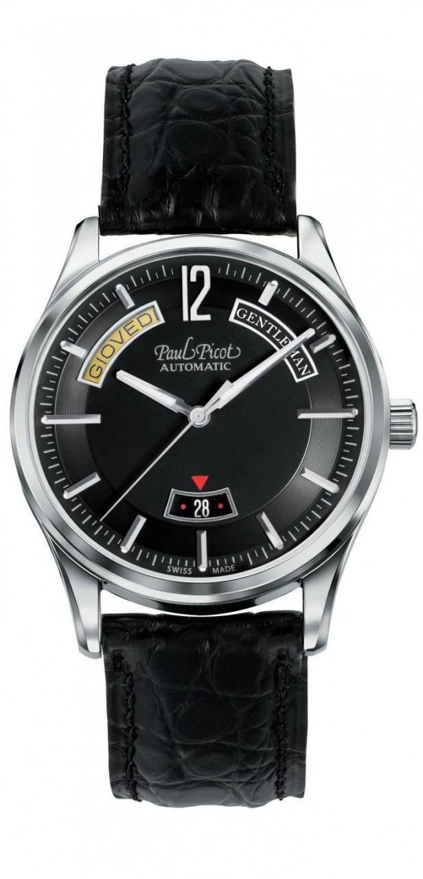 На циферблате на 10 часов - широкая арочная апертура в которой отображаются дни недели. Цвет надписи каждого дня недели (на французском языке) соответствует одному из семи цветов радуги. Дата на 6 часах.