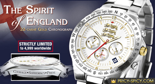 Гравированные с использованием 22-каратного золота, часы Spirit of England Chronograph прославляют все выдающиеся победы Англии и ее народа - победа на чемпионате мира по футболу в 1966 году, многочисленные олимпийские триумфы, другие крупные победы и достижения. Надев такие часы ты говоришь всему миру: "Я горд тем, что живу в Англии, я горд быть гражданином этой великой страны!".