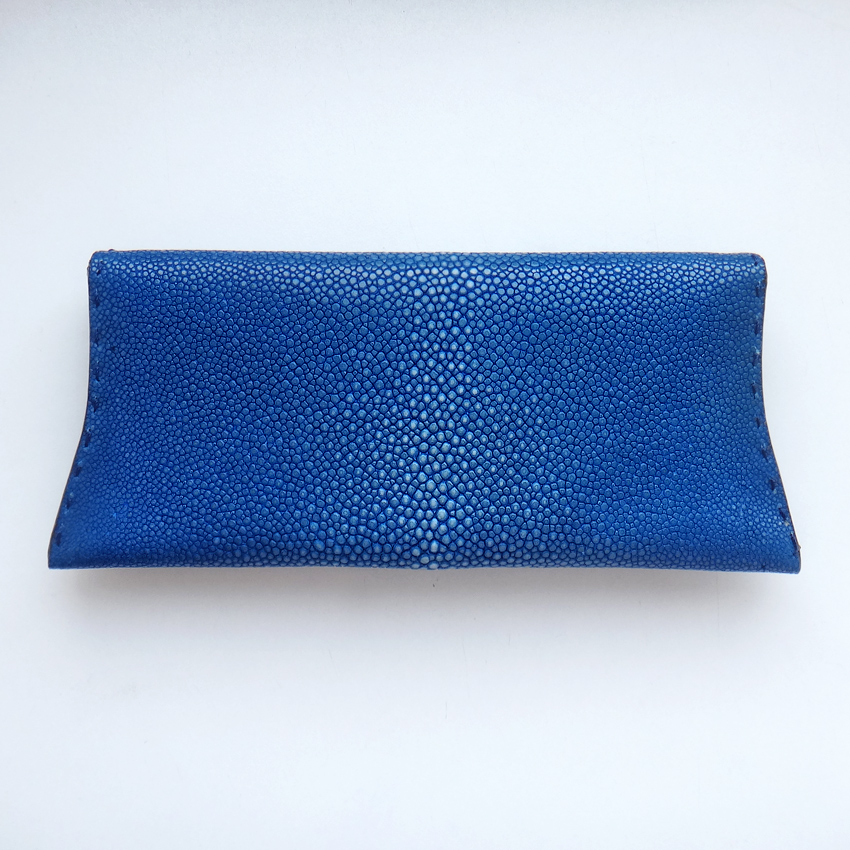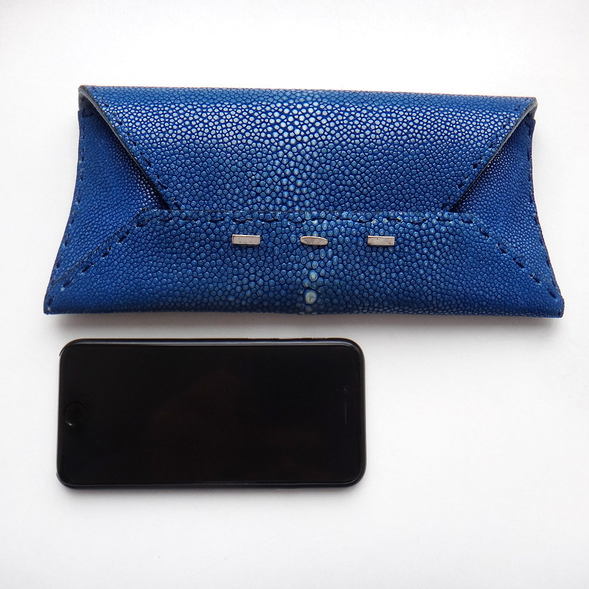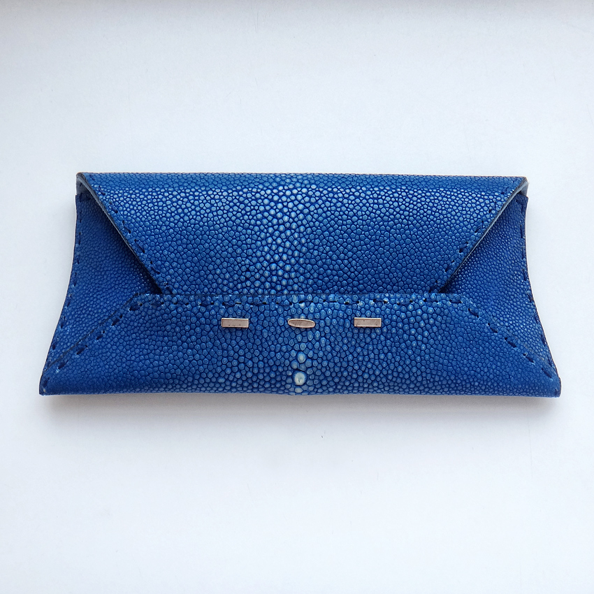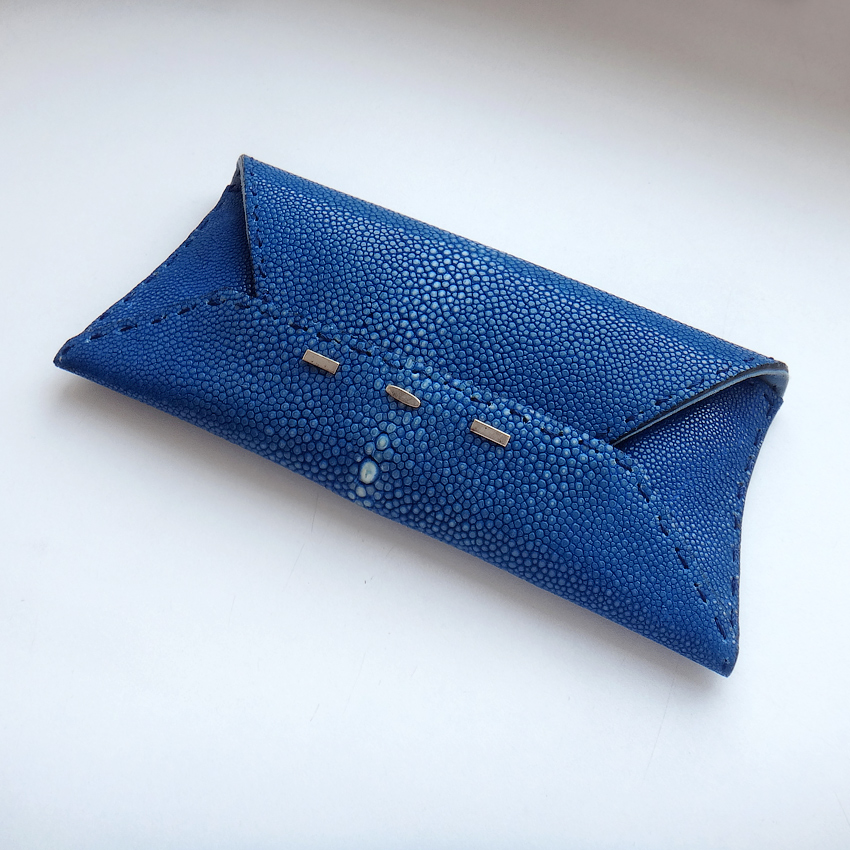 Из натуральной кожи ската, ярко-синего цвета. Отделка серебро 925 пробы, интерьер мягчайшая натуральная замша сине-голубого цвета. Номерная табличка из серебра.
