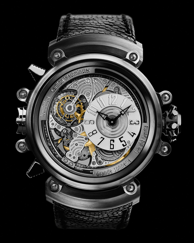 Мастер инноваций Gerald Genta представляет сложнейшие часы в категории Grande Sonnerie – Arena Metasonic. Серия лимитирована 10 экземплярами. Поскольку наручные часы относятся к классу Grande Sonnerie (часы с Большим боем) главное отличие и функциональный приоритет отданы звуку.
