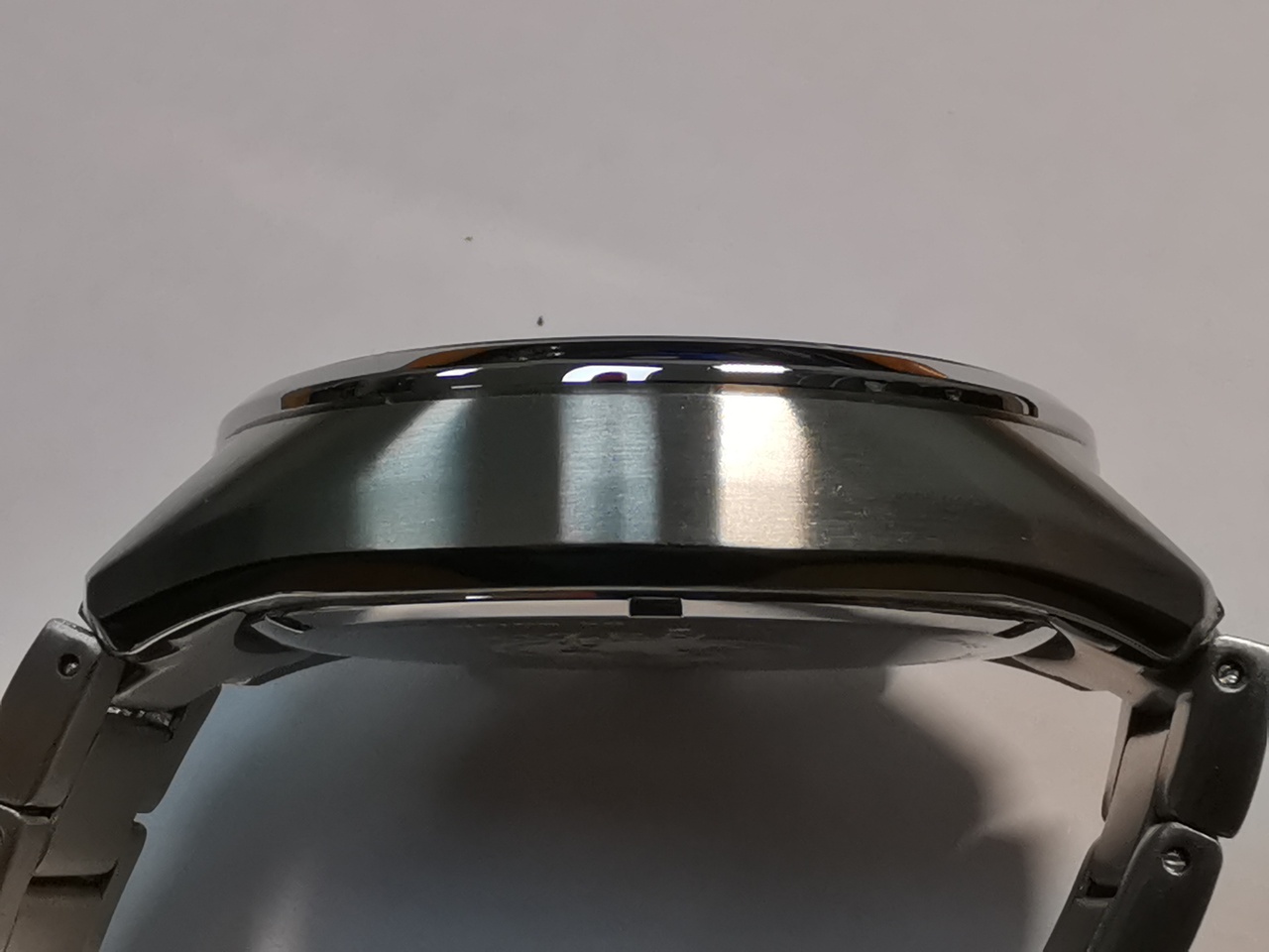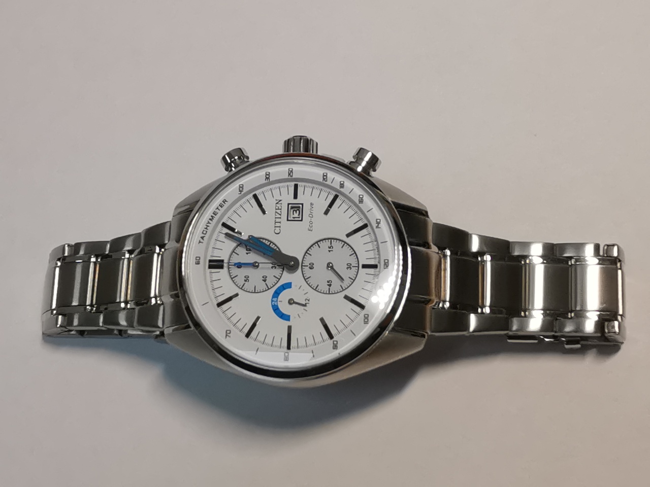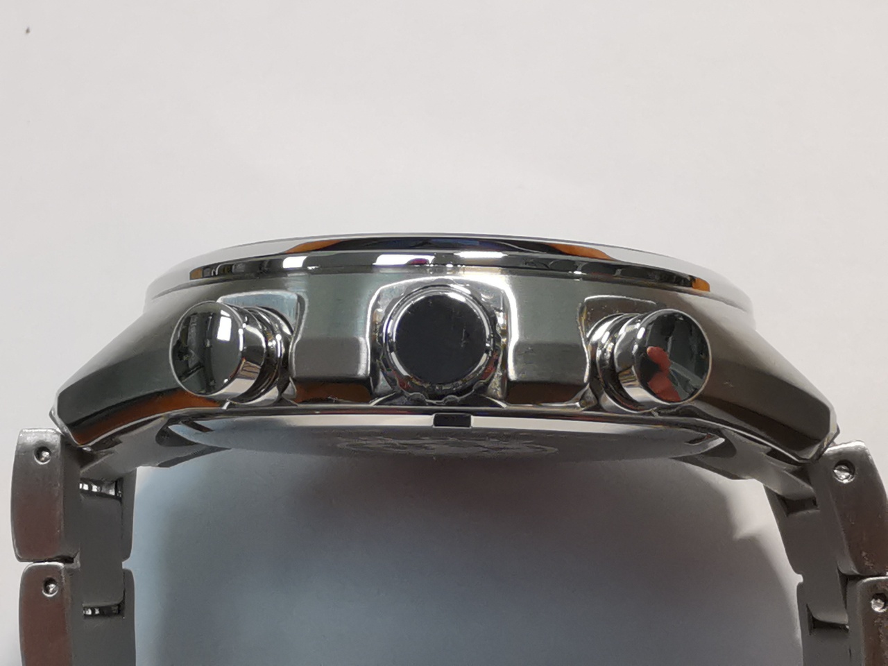 Общее впечатление от часов положительное, но хотелось бы отметить несколько моментов. По современной модной тенденции часы имеют довольно крупный корпус диаметром 45мм. Полукупольное , с намеком на ретро стекло накрывает полностью циферблат с тахиметрической шкалой. Это, конечно красиво,- посматривая на них, я чувствую себя капитаном стерильно-белого космического корабля. Это чувство усиливают стрелки концептуального вида. А вот браслет, отражает всеобщую тенденцию к экономии, он сборный, из многократно сложенных листиков нержавейки. Застежка «бабочка» тоже штампована, имеет логотип. Порадовали концевые звенья,- они литые! Чаще всего мне встречались варианты, где литые браслеты комплектовались жестяными концевыми звеньями.