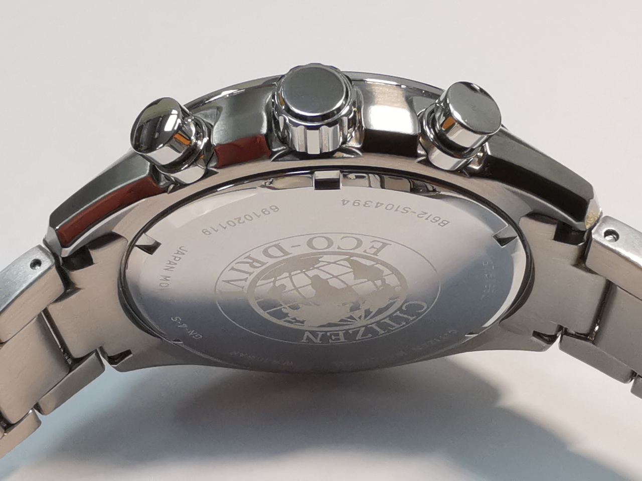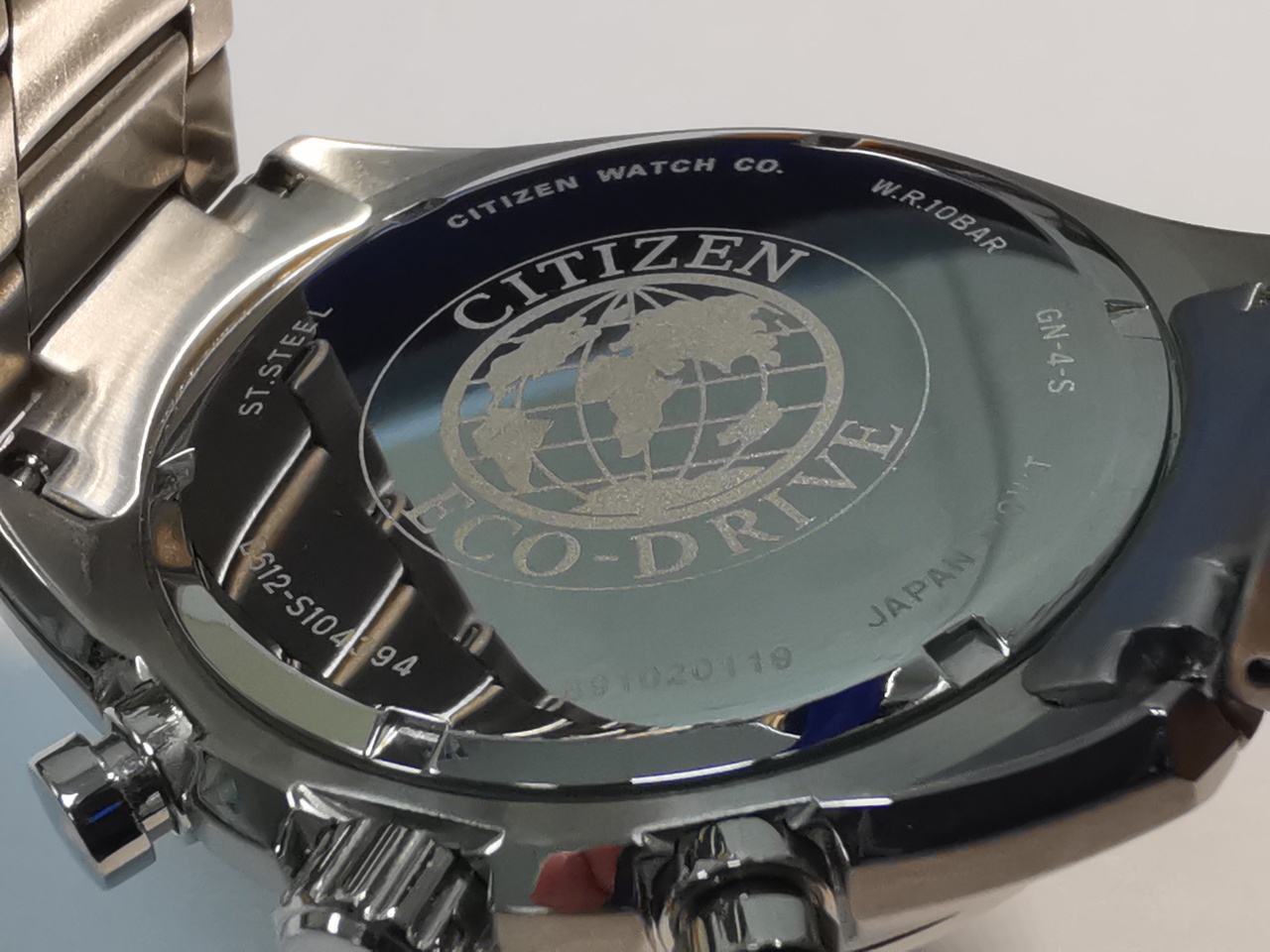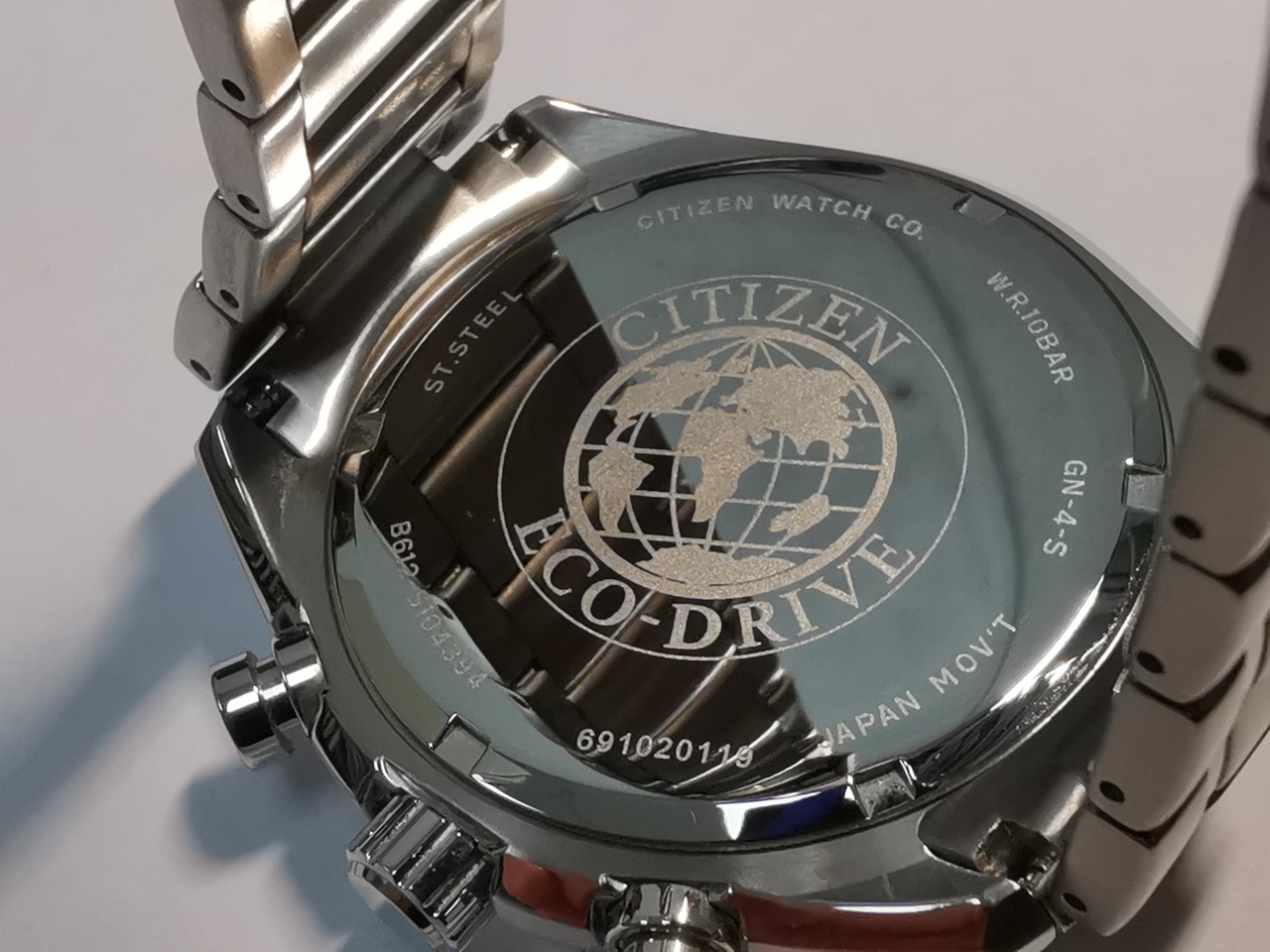 Задняя крышка на резьбе, плоская , полированная. На крышке неглубоко выгравированы надписи: Citizen Eco Drive, GN-4-S, w.r 10 bar,japan mov’t, 691020119, b612-s104394, st.steel, citizen watch co.