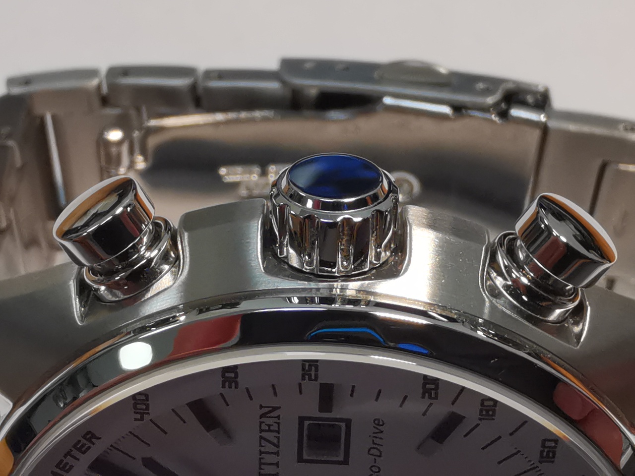 Заводная головка цилиндрическая, полированная, без резьбы, переводит дату и стрелки. Боковая поверхность заводной головки имеет глубокие редкие канавки. Верхушка головки имеет фаску и плоскую вершину. Кнопки хронографа полированы, стилизованы под некие «поршни-клапаны», довольно популярные в спортивных хронографах.