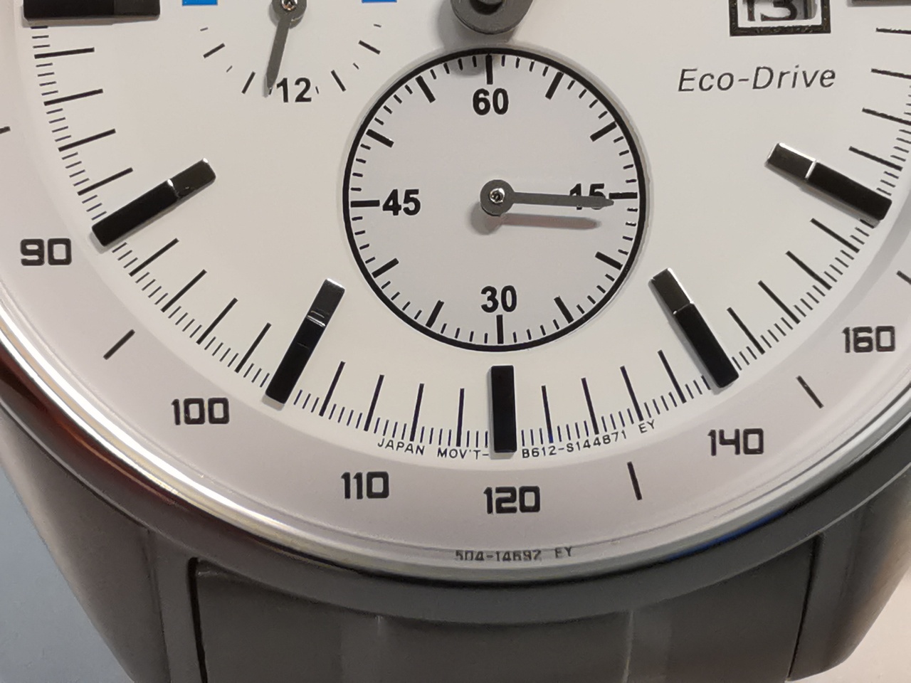 Циферблат трехслойный белоснежный, без переливов. Кольцо с тахиметрической шкалой заметно возвышается над циферблатом, габаритами напоминая внутренний безель. На большом белом поле циферблата расположены три дополнительных малых циферблата. Два из них расположены вертикально и имеют отношения к отсчету секунд и минут в режиме хронографа, под них специально вырезаны круглые окошечки. Третий малый циферблат расположен слева, у цифры 9, имеет самую маленькую стрелку, и обозначен на основном циферблате разметкой синей краской в стиле день-ночь, он отображает время в 24х часовом формате. Окошко даты прямоугольное, выделено черной рамкой. Даты на диске выделены жирненьким шрифтом, видимо, потому, что дата утоплена относительно поверхности циферблата, из за его значительной толщины.
