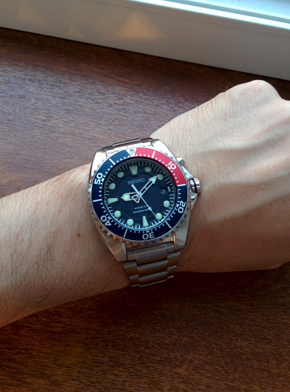 Продаю брутальный кинетический дайвер Seiko SKA369P1 Pepsi. Часы покупались год назад новыми у уважаемого форумчанина. Есть маленькие царапины на браслете и на безеле, ничего критичного (видно на фото), стекло без царапин. Полный комплект + оригинальный каучуковый ремешок (новый) и дешевенький нато. Вообщем, полный набор на лето! К часам никаких нареканий, продаю по причине покупки Сумо синеньких