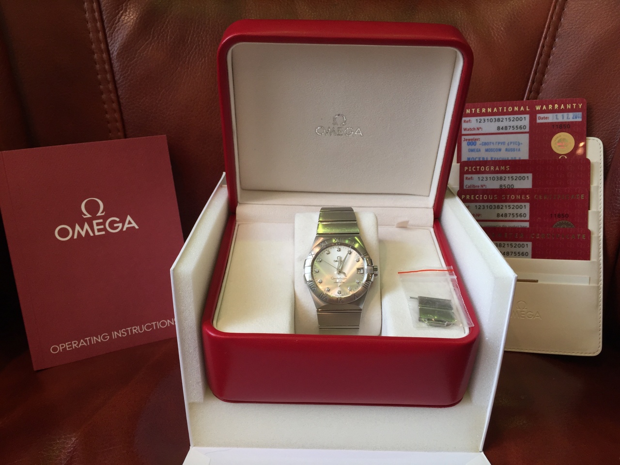 Доброго времени суток уважаемые форумчане. Вашему вниманию представляется Omega constellation co-axial chronometer 38m. Часы куплены в подарок на новый 2012 год 31.12.2011 года (часы на горантии) все документы и коробки в наличии, браслет полный, полировка не делалась и не требуется часы действительно в замечательном оригинальном состоянии. На циферблате 11 бриллиантов смотрится очень красиво по фото не передать!! Вот ссылки с характеристиками: