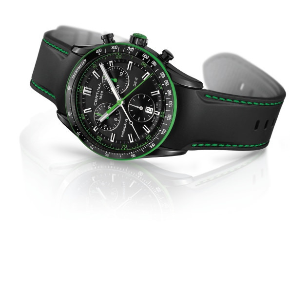 Хорошо известный хронограф CERTINA DS-2 претерпел яркую трансформацию за счет добавления спортивных акцентов. Они создаются кольцом зеленого или красного цвета, обрамляющим безель из нержавеющей стали, и соответствующей отделкой верхушки заводной головки. Эти цветовые акценты контрастируют с черным PVD-покрытием корпуса, часовой и минутной стрелками с нанесенным на них люминесцентным составом Superluminova и черным каучуковым ремешком с прострочкой соответствующего цвета.