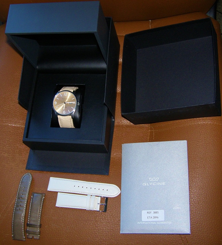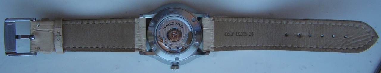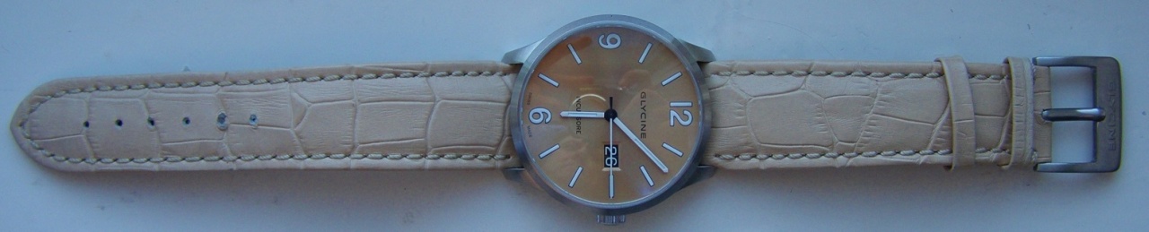 Swiss made, Глицин (линейка "Инкурсор"), крупные часы (44мм, без учета заводной головки, а в реальности, благодаря узкому безелю выглядят ещё крупнее). Механизм автоматический ЕТА 2896, усложнение Big Date (большая, двойная дата), отличная считываемость циферблата, стекло - сапфир с обоих сторон, водозащита 50м. Крупные цифры и стрелки, покрыты люминесцирующим составом, в темноте горят не хуже Панераев. Коробка, бумаги, дополнительно два ремня шириной 23мм, родной Глицин б/у и белый неродной новый. Отличные часы, на ходу, все функции работают, благодаря небольшой толщине отлично садятся на любую руку.