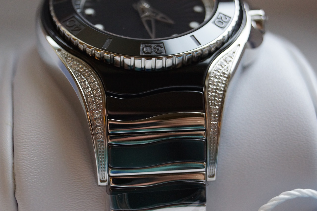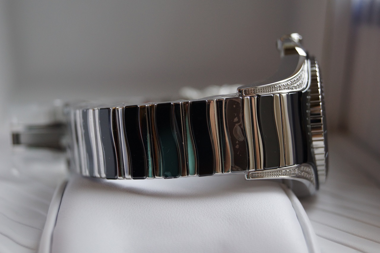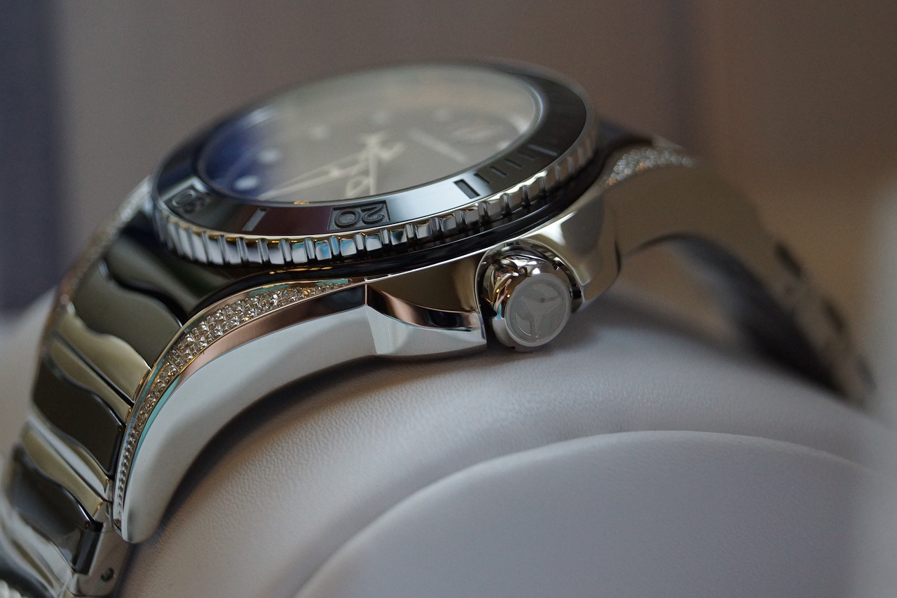 Эти боковины корпуса инкрустированы бриллиантами, напоминающими светлые отметины, украшающие спину и кончики плавников ската. Стальной корпус и браслет украшены вставками из темно-серой керамики, воспроизводящей благородный цвет спины ската Манта, а также защищающей часы от царапин. В такой же гамме выполнен вращающийся рант с дайверским кольцом и циферблат, гравированный волнистым узором.