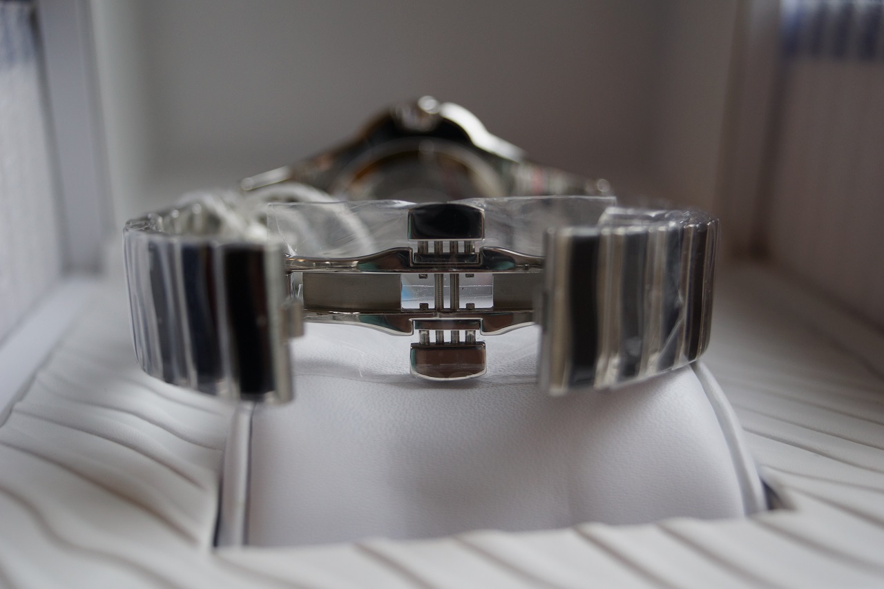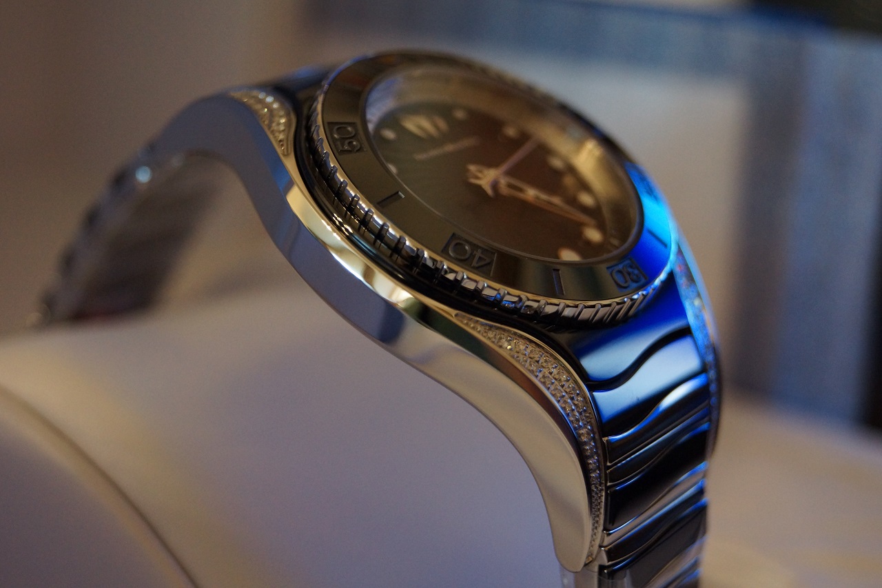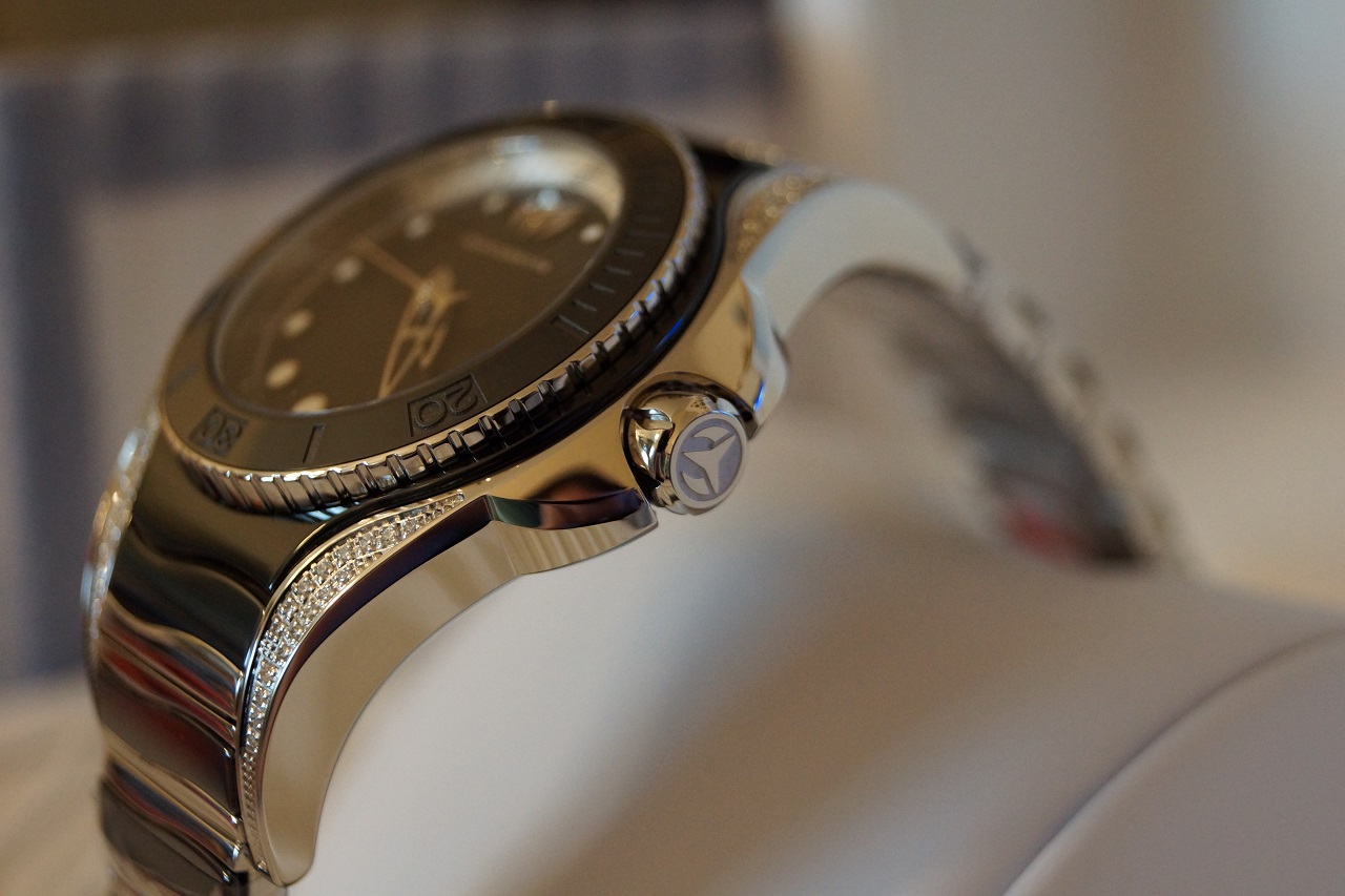 Эти боковины корпуса инкрустированы бриллиантами, напоминающими светлые отметины, украшающие спину и кончики плавников ската. Стальной корпус и браслет украшены вставками из темно-серой керамики, воспроизводящей благородный цвет спины ската Манта, а также защищающей часы от царапин. В такой же гамме выполнен вращающийся рант с дайверским кольцом и циферблат, гравированный волнистым узором.
