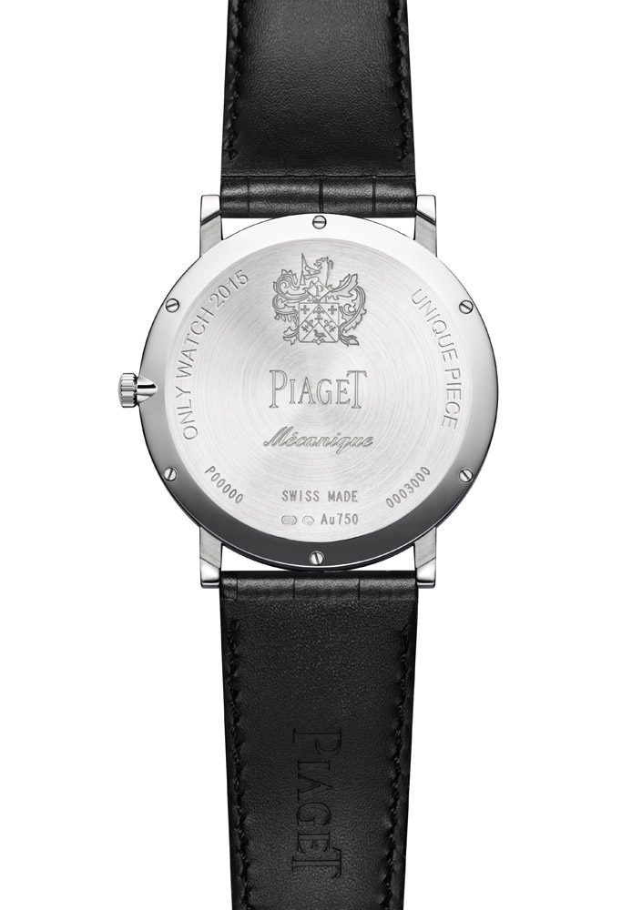 Новая уникальная модель Altiplano 900P Only Watch 2015 Edition, которая является самой тонкой механической наручной моделью в мире, от швейцарской часовой компании Piaget выпущена для шестого по счету благотворительного аукциона Only Watch, который состоится 28 сентября текущего года в Женеве (этот аукцион проводится один раз в два года; все доходы от него идут на поддержку исследований мышечной дистрофии Дюшенна - заболевания, поражающего одного из 3500 мальчиков, всего около 250000 детей, подростков и молодых людей по всему миру; важно также отметить, что на торги принимаются исключительно модели Piece Unique; предварительно эти уникальные модели совершат мировое турне с остановками в Монако, Гонконге, Пекине, Нью-Йорке и Лондоне, с тем, чтобы с ними могли ознакомиться коллекционеры и любители часов из разных стран мира).
