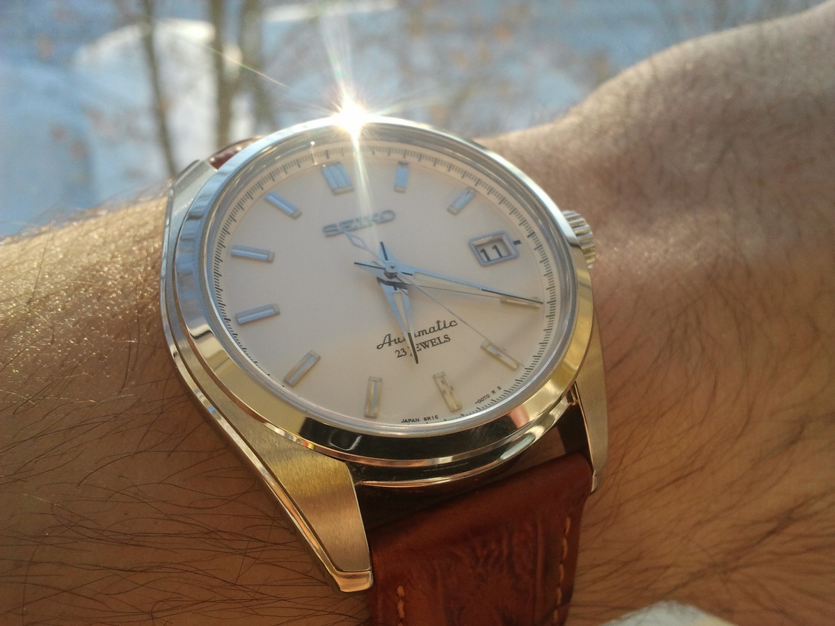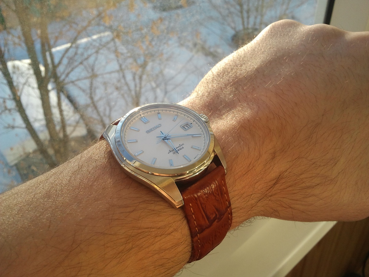 http://forum.watch.ru/showthread.php...hlight=sarb035 . Сначала не поверил своим глазам, всего 5000 ! Сразу задал вопрос продавцу, не опечатка ли, ответ : нет. Мгновенно резервирую и на следующий день произвожу оплату (как оказалось вовремя успел, так как продавца засыпали более привлекательными предложениями, но он оказался очень порядочным (за что огромная благодарность!) человеком, который сохранил резерв за первым откликнувшимся). Через 5 дней часы оказались у меня. На первый взгляд показались мелковатыми и легковатыми. Но на руку сели идеально (где-то 17.5см запястье). А вчера был прикуплен кожаный ремешок (см.фото) - результат, на мой взгляд, выше ожидай. Даже чем-то стали похожу на мой идеал: